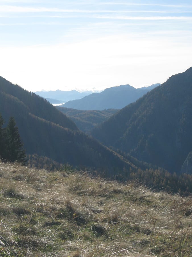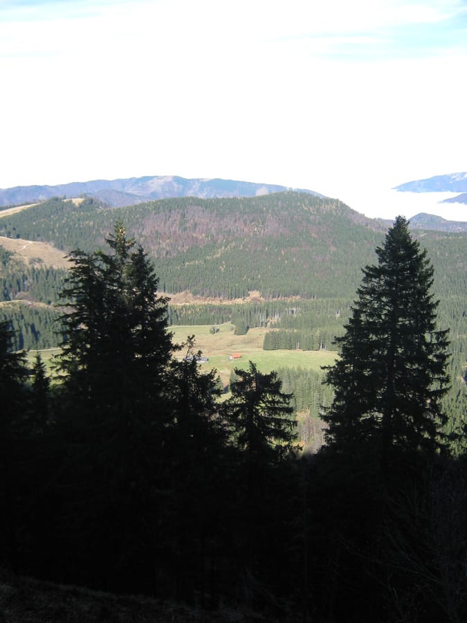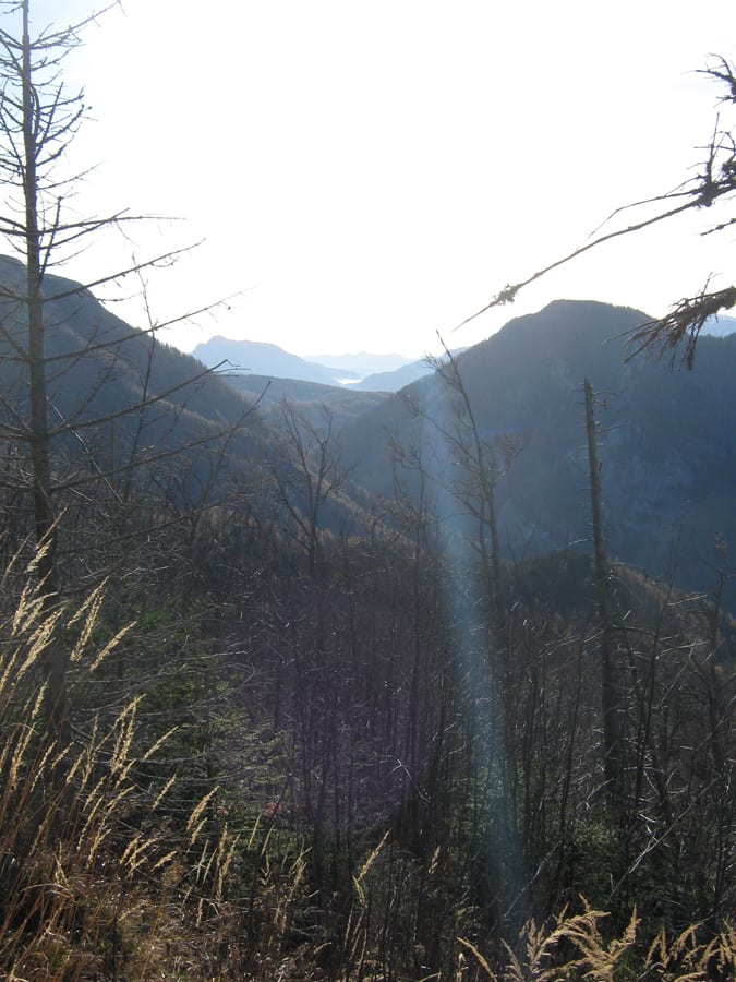 Also los Richtung Bodinggraben und hinauf auf den Trämpl – das müsste reichen! Beim Start beim Jagahäusl sind wir a) ganz alleine und b) im Nebel. Das mit dem Nebel ändert sich bald und schnell sehen wir die Sonne – zwar noch nicht selbst über den Bergen, aber wenigstens den Sonnenschein auf den Bergen gegenüber.