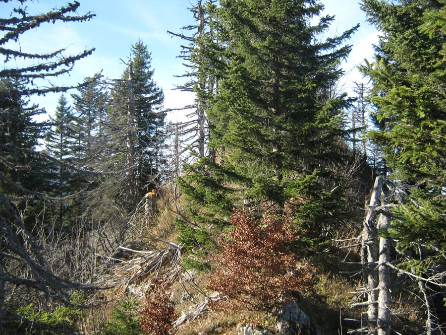 Erste Pause mit Sonnenbad auf der (geschlossenen) Ebenforstalm, dann über die Flanke vom Trämpl hinauf zum Luchsboden. Wir gehen auf der Nordseite (auch vom Luchsboden weiter zum Trämpl) hinauf, zu der jetzt keine Sonne mehr kommt. Es ist also ziemlich nass und rutschig (menschlich gesprochen; hundlich gesprochen ist es ganz normal)