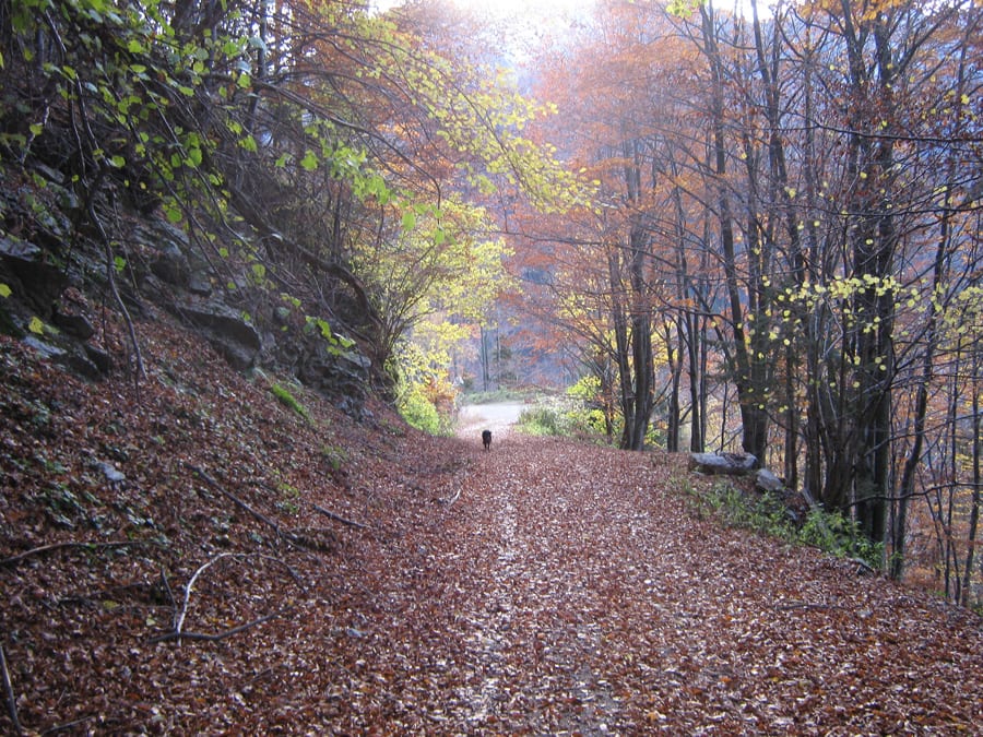 Vom Trämpl weg gibt es aber keine Pausen mehr: erst der Abstieg zur Schaumbergalm und von dort gleich weiter bis zum Jagahäusl. Den Steig durch den Wald hinunter lassen wir heute aus: so viel Laub, dass man den Weg kaum findet und drunter rutschig – s’Herrl möchte lieber über den Frostweg gehen.