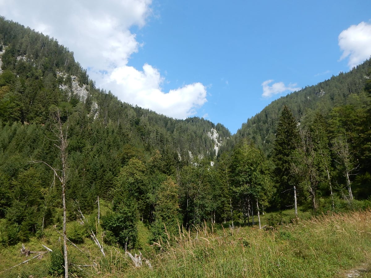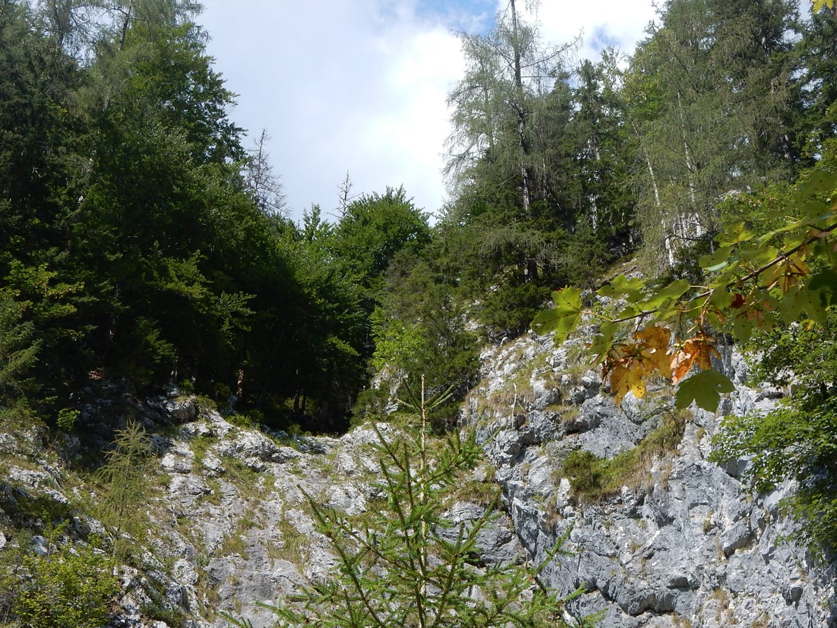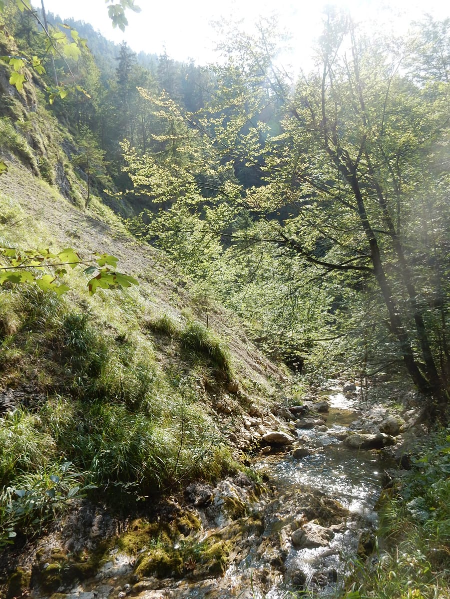 Zuerst neben dem Hinteren Rettenbach und dann neben dem Fischbach wandern wir bis zum Tal-Ende. Das ist ein Kessel, aus dem es nur einen bequemen Ein- und Ausgang gibt. Den Steig hinauf und hinaus über die steile Wand ersparen wir uns heute und kehren nach einer kurzen Pause um – zurück gehts auf dem selben Weg.