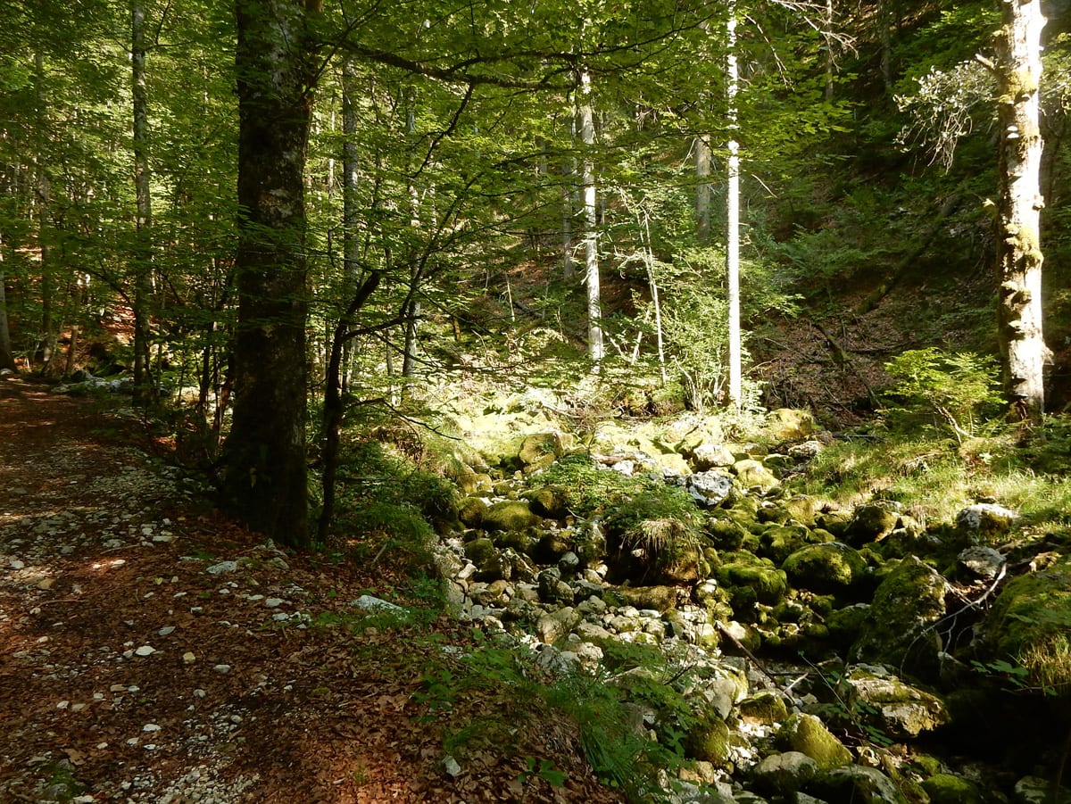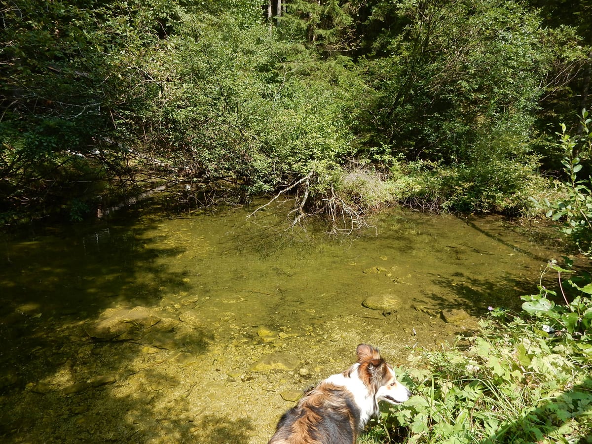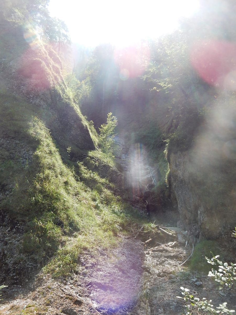 Am unteren Ende des Tales kommen wir an den Rettenbachquelle vorbei. Eine ist direkt neben dem Weg, die andere ein Stück bergauf. Die oberen sehen wir heute leider nicht (zu wenig Wasser), sondern hören sie nur unten der Felsbrocken sprudeln. Das Wasser kommt dann erst ein Stück unterhalb der Quelle an die Oberfläche.