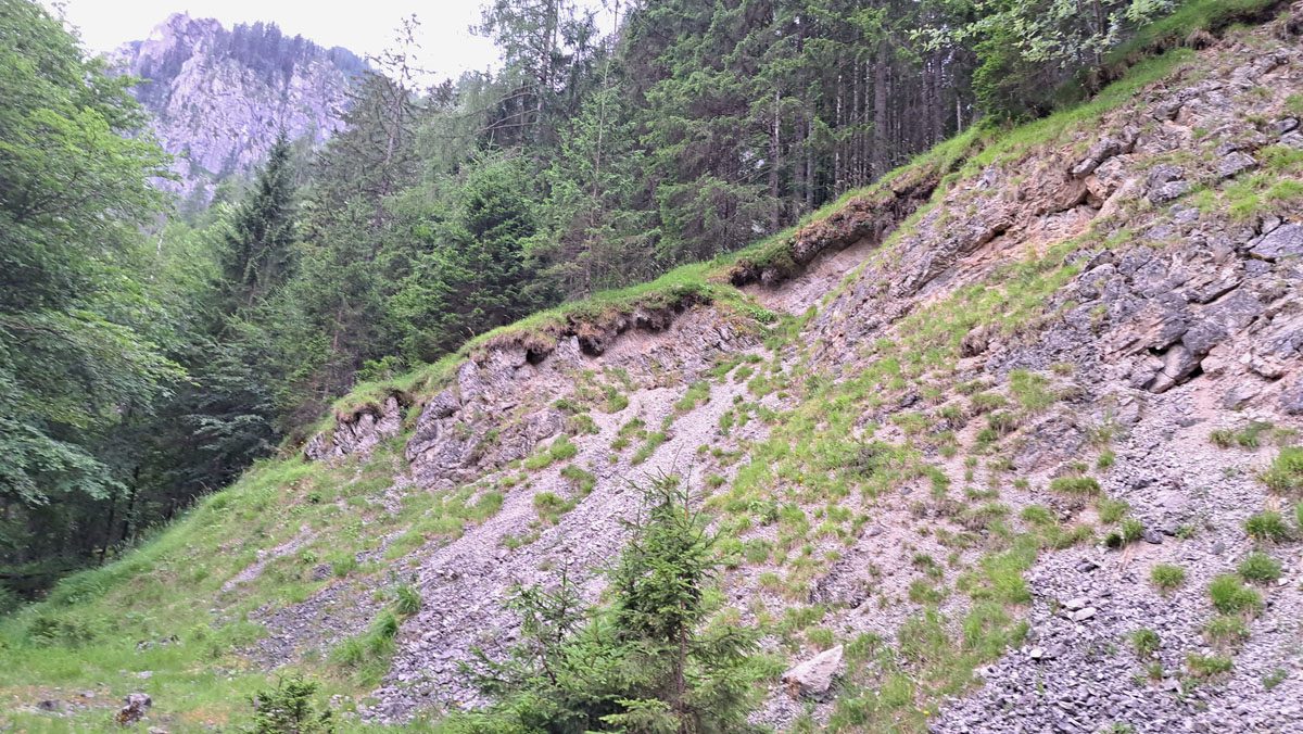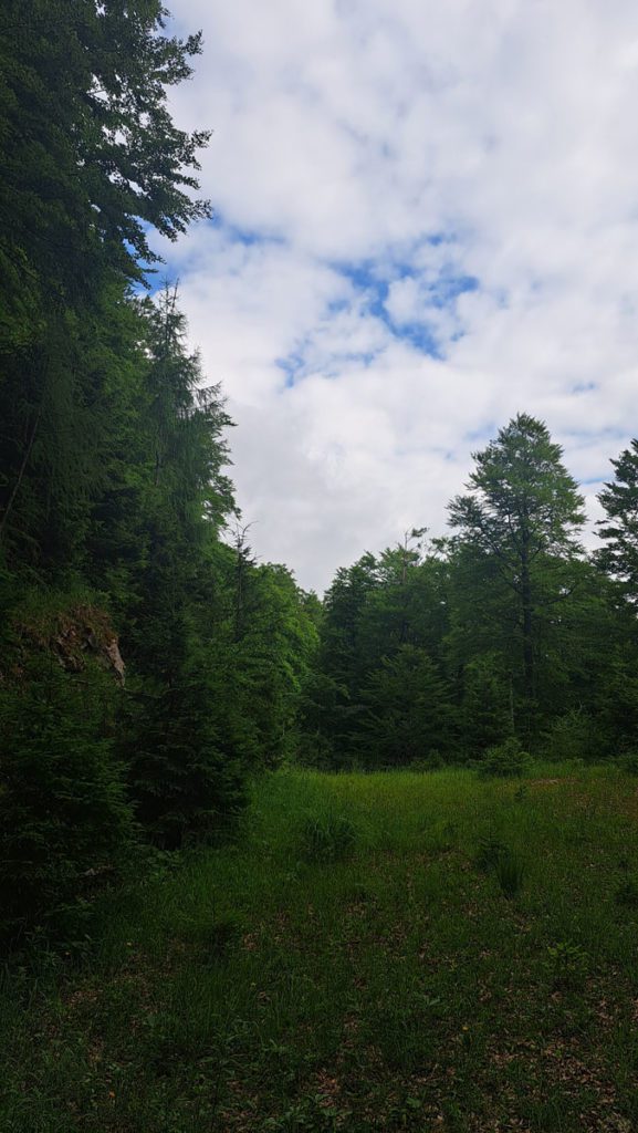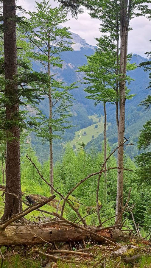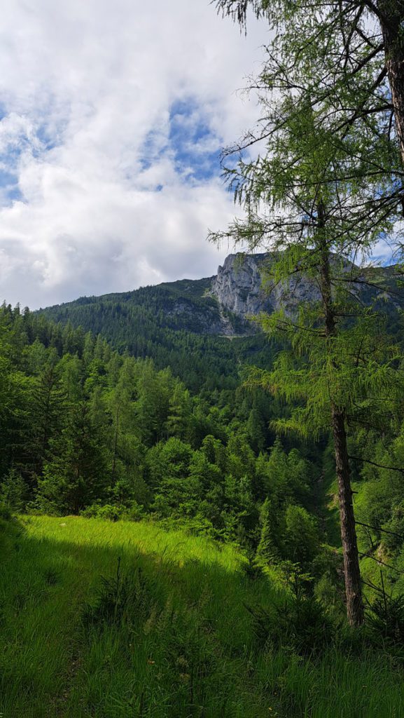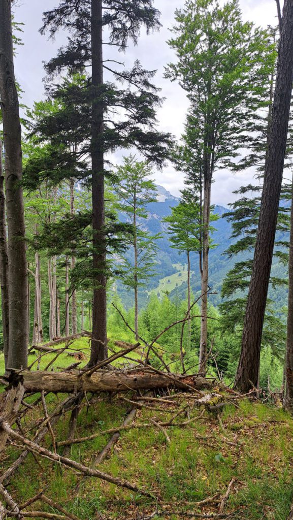 Zuerst kraxeln wir ein bisserl oberhalb der Krahl-Alm herum, um vielleicht doch einen direkten Weg hinauf zum Hütberg zu finden. Wir stellen fest, dass es hier überall viel zu steil ist. Aber etwas weiter oben auf halber Strecke zum Gipfel entdecken wir dann doch einen Weg quer durch den Wald; den heben wir uns aber für später einmal auf. Apropos Gipfel: da hat jemand ein „Gipfelkreuz“ hingebastelt – wir meinen, dass es manchmal besser ist, weniger zu tun, weil das Ding macht den Gipfel nicht wirklich schöner 🙂