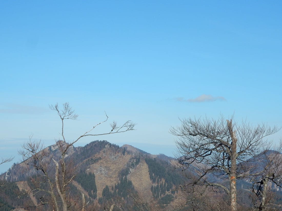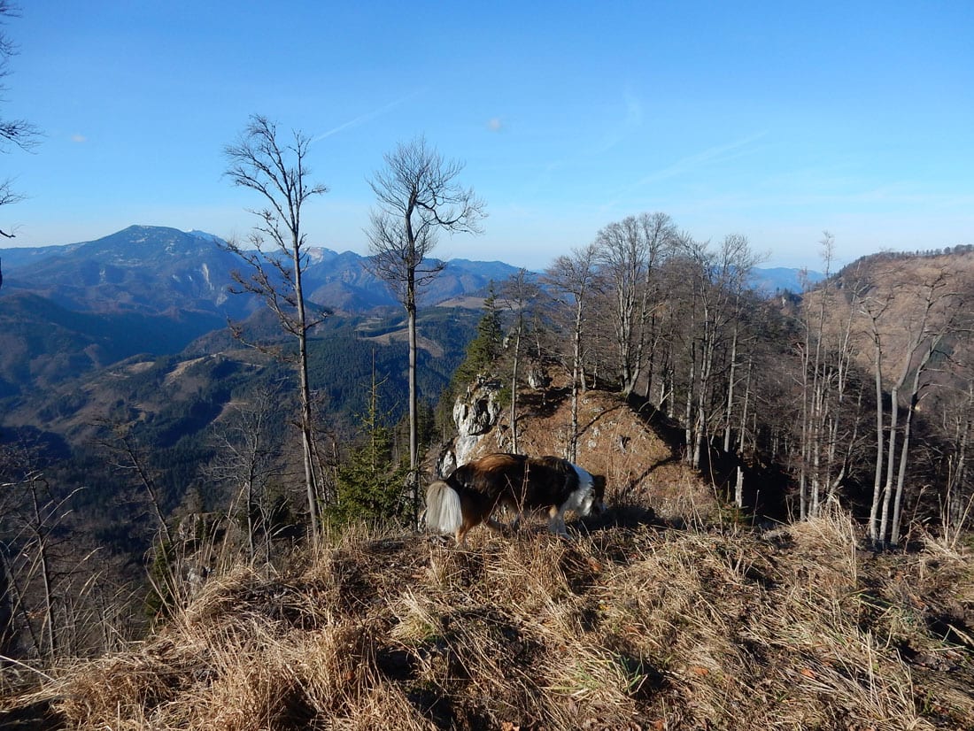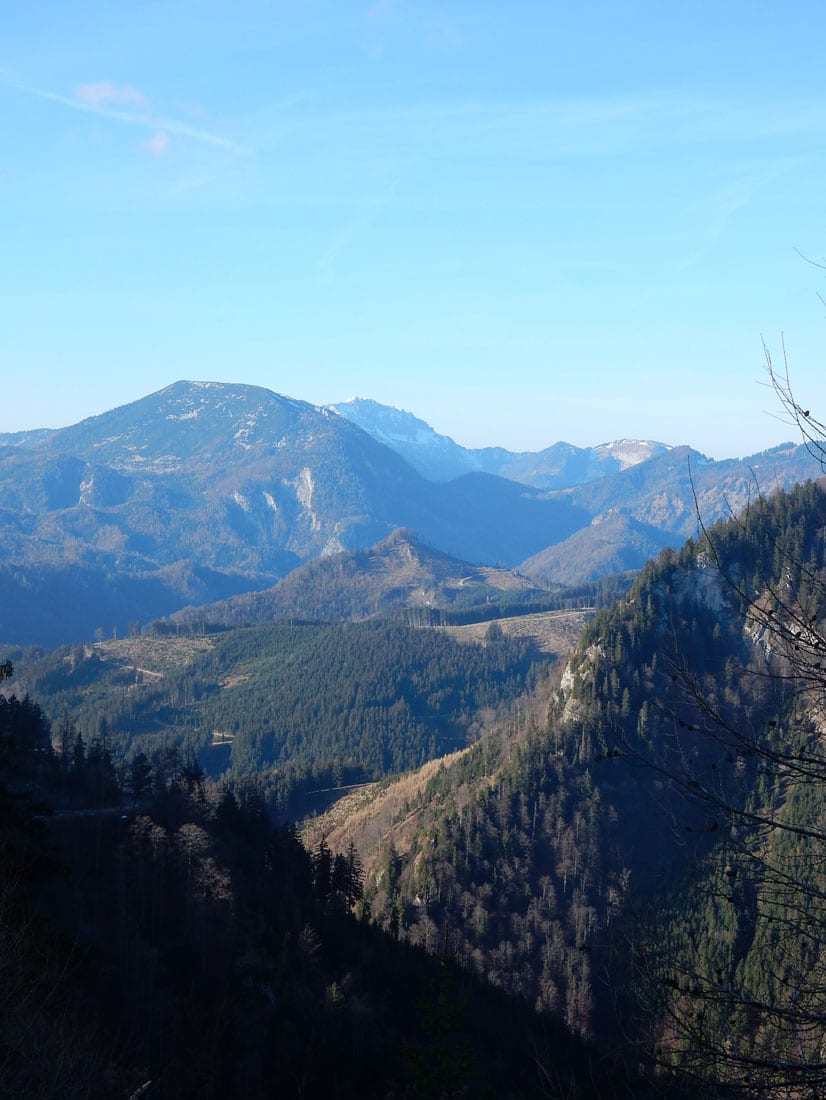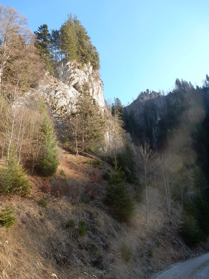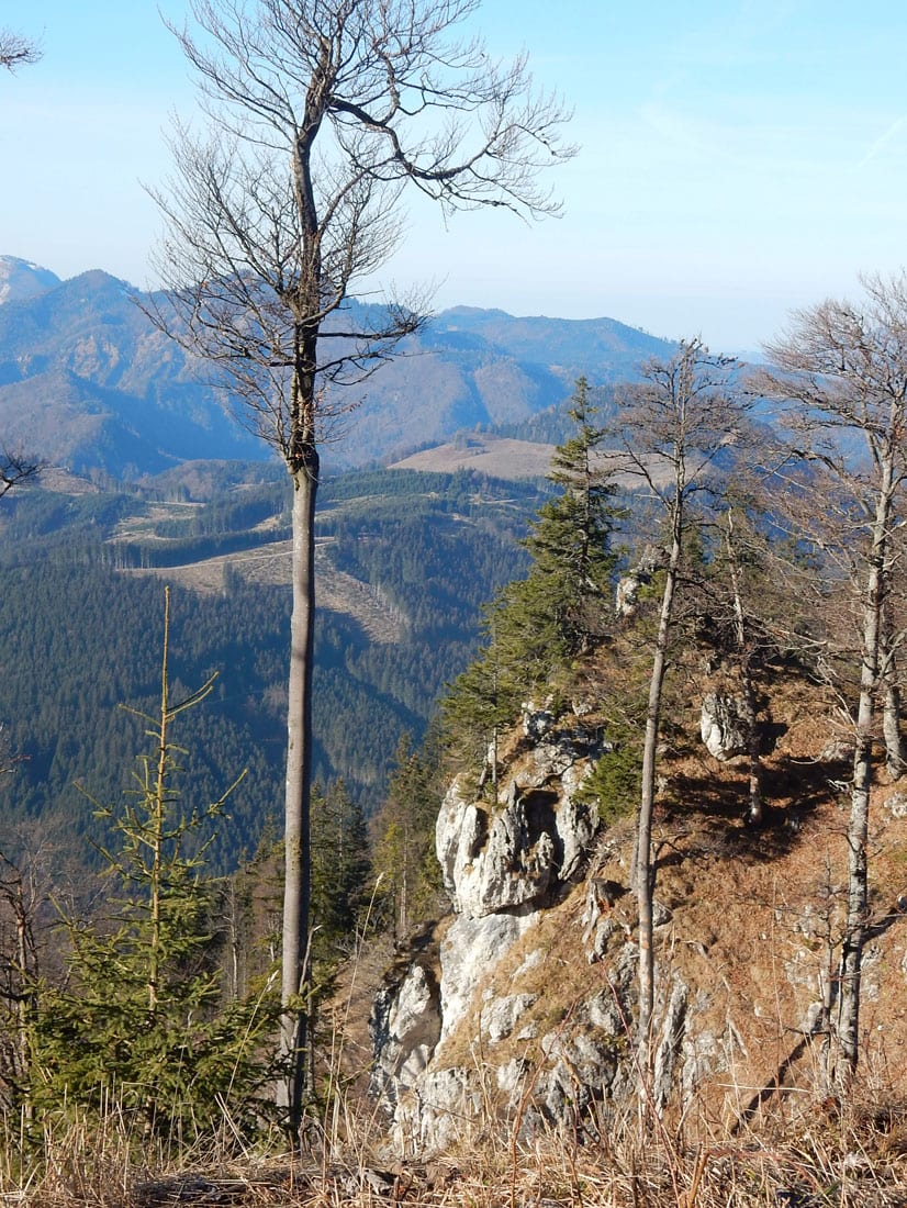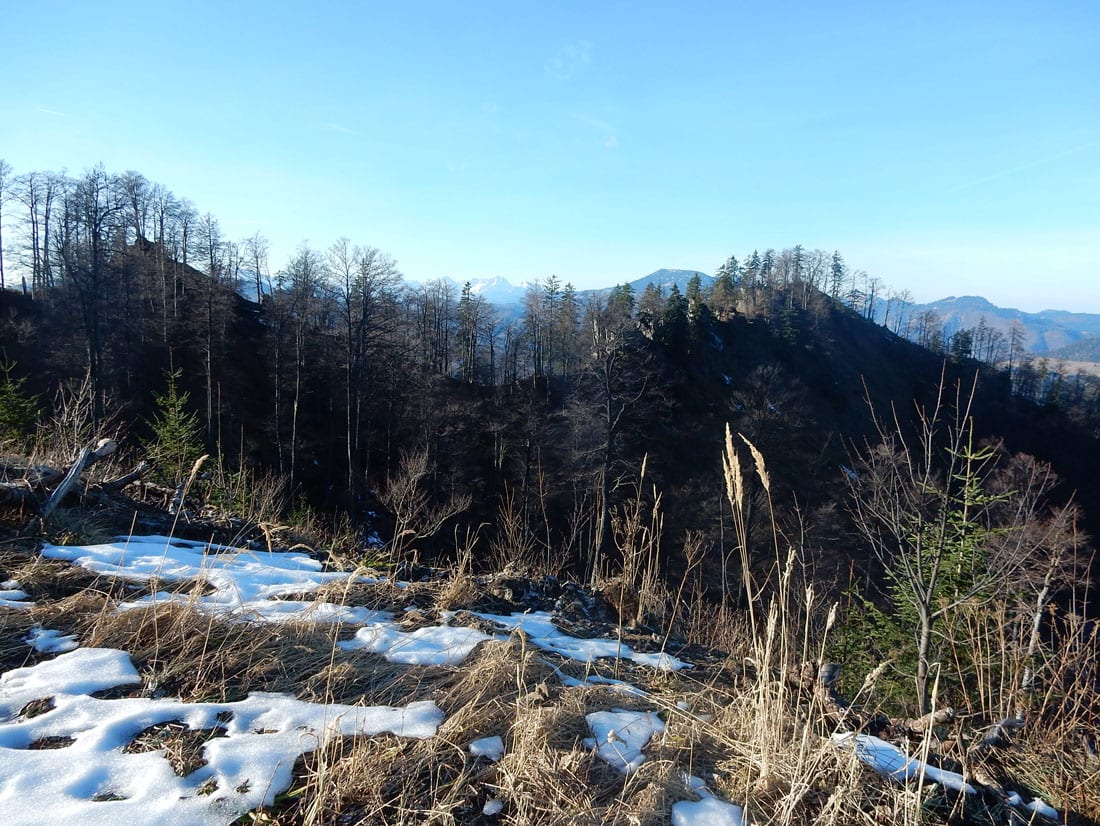 Am Horizont schimmern die Haller Mauern, das Tote Gebirge und sogar das Sengsengebirge mit Schnee auf den Spitzen. Wir müssen aber bis auf ca. 1.300m hinauf wandern, um ein paar Schneeflecken in schattigen Winkeln zu finden.