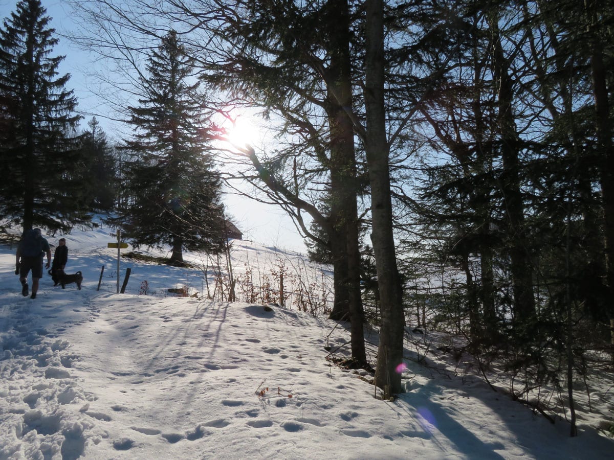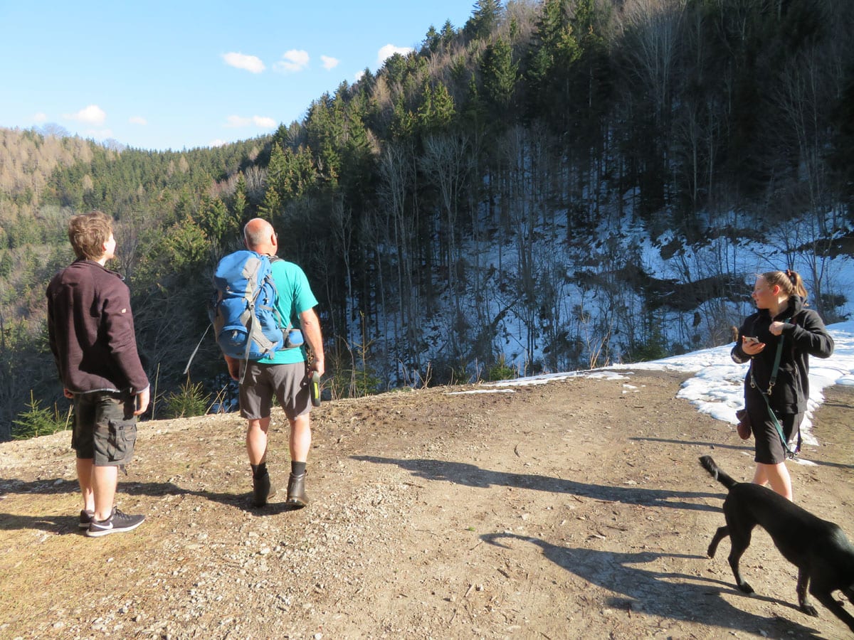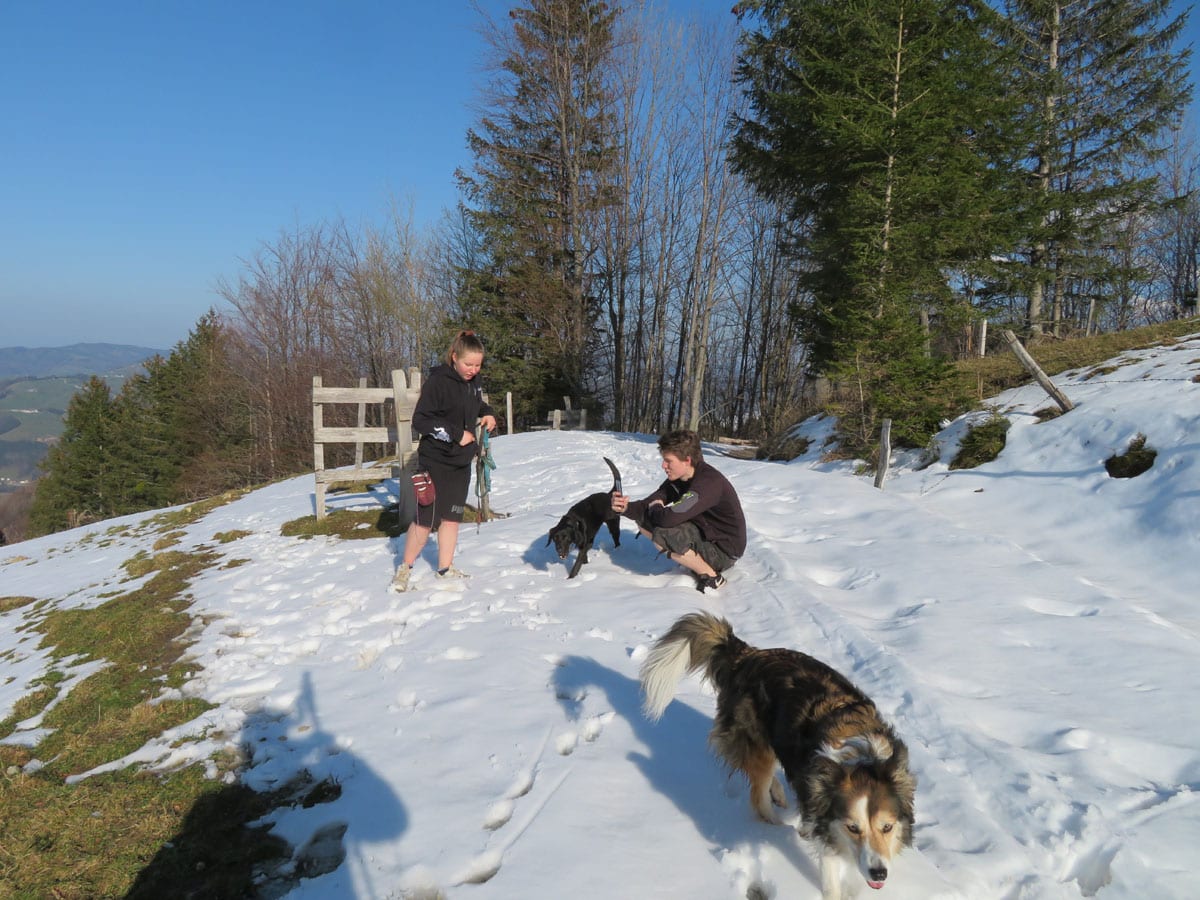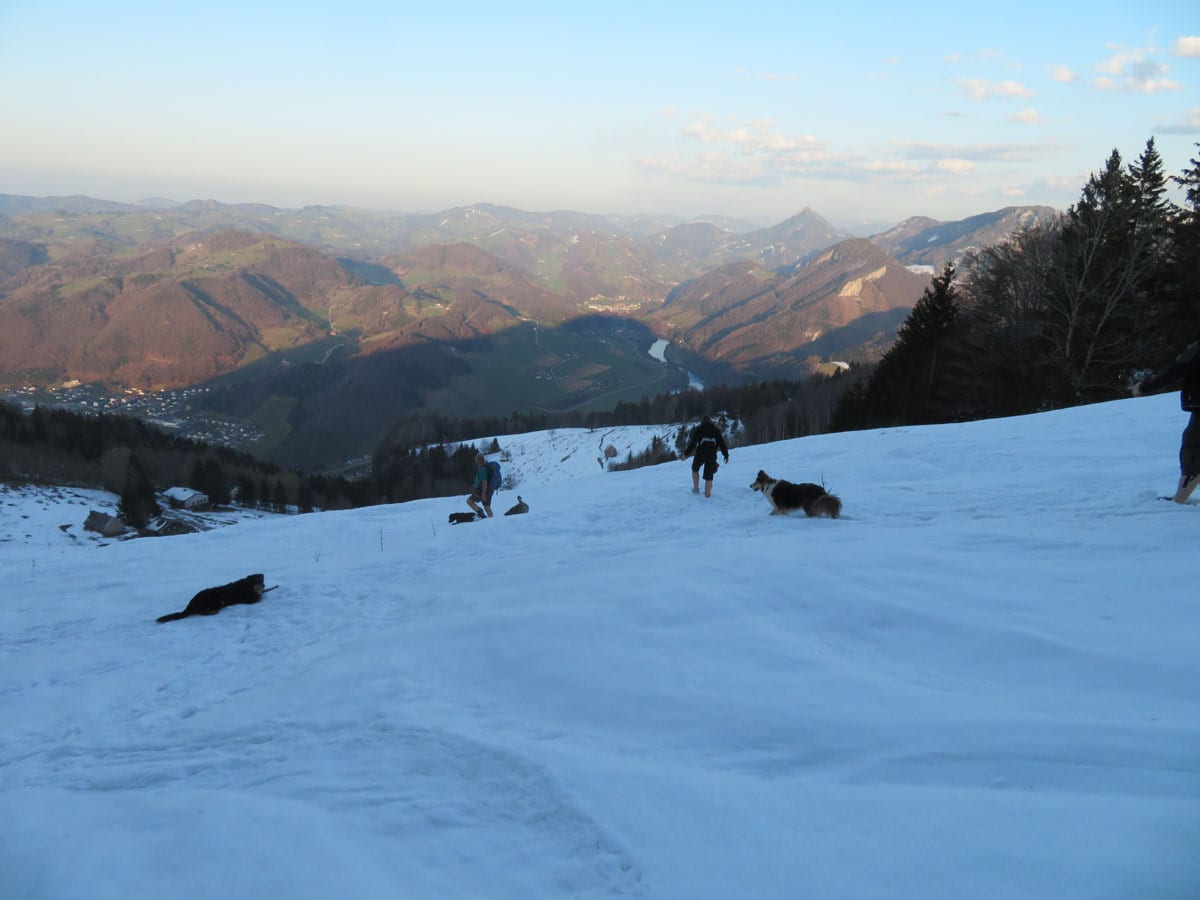 Und weil auf alles das auch noch die Sonne strahlt, ist so eine Freitag-Nachmittag-Wanderung gemeinsam mit Kira, Mato und ihren Menschen doch das einzig richtige, das man machen kann (Weil es sich durch den Schnee etwas langsamer stapft als ohne, kürzen wir ein bisserl ab und lassen heute das Kruckenbrettl weg).