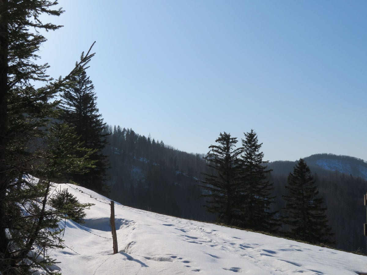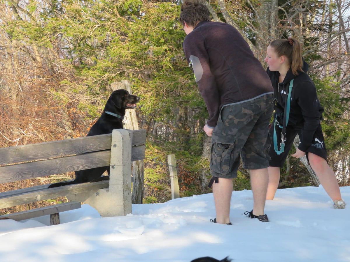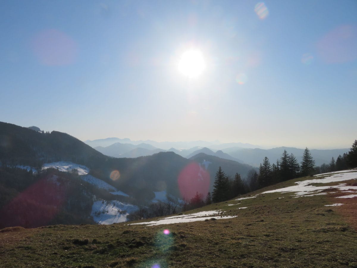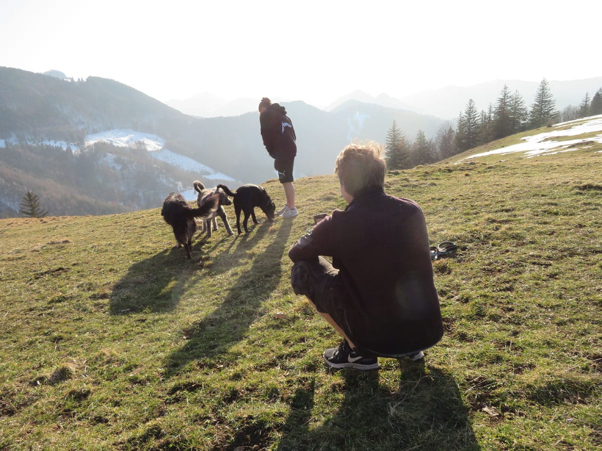 Und weil auf alles das auch noch die Sonne strahlt, ist so eine Freitag-Nachmittag-Wanderung gemeinsam mit Kira, Mato und ihren Menschen doch das einzig richtige, das man machen kann (Weil es sich durch den Schnee etwas langsamer stapft als ohne, kürzen wir ein bisserl ab und lassen heute das Kruckenbrettl weg).