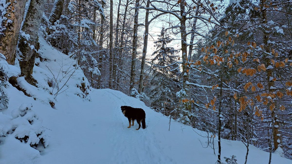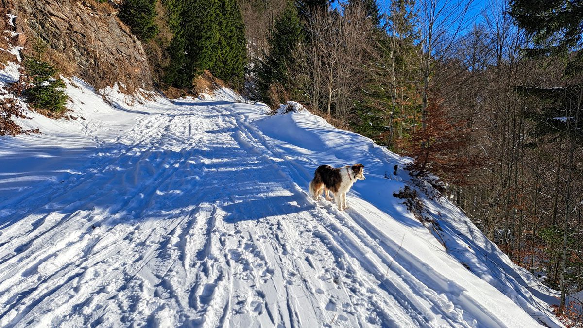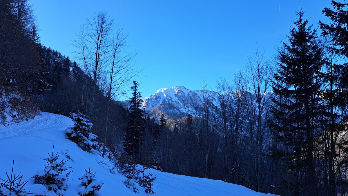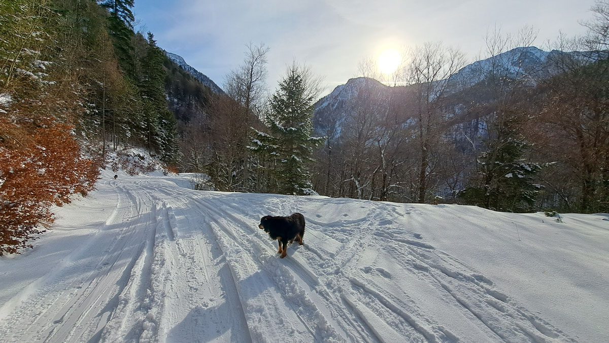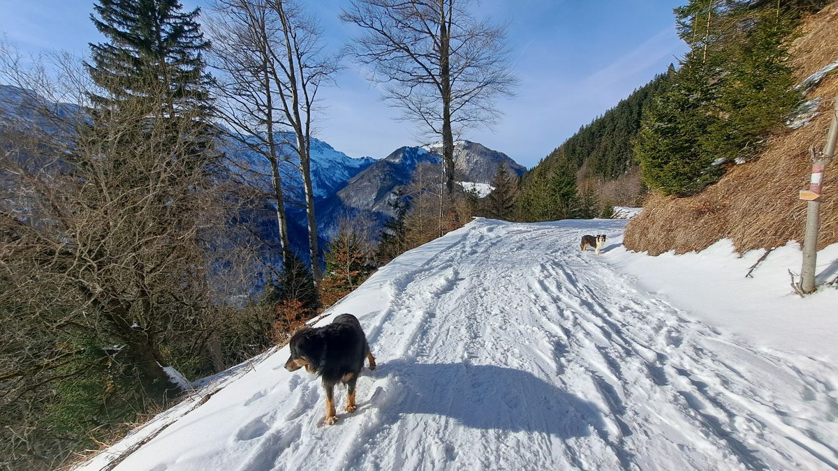 Bergauf wird es schnell warm, logisch, und die Sonne merken wir auch bald. Mit den Schneeschuhen (Ernst mit den Schiern) zuerst über den Steig und dann über die Forststraße bis zur Almhütte ist es eine sehr, sehr angenehme Wanderung.