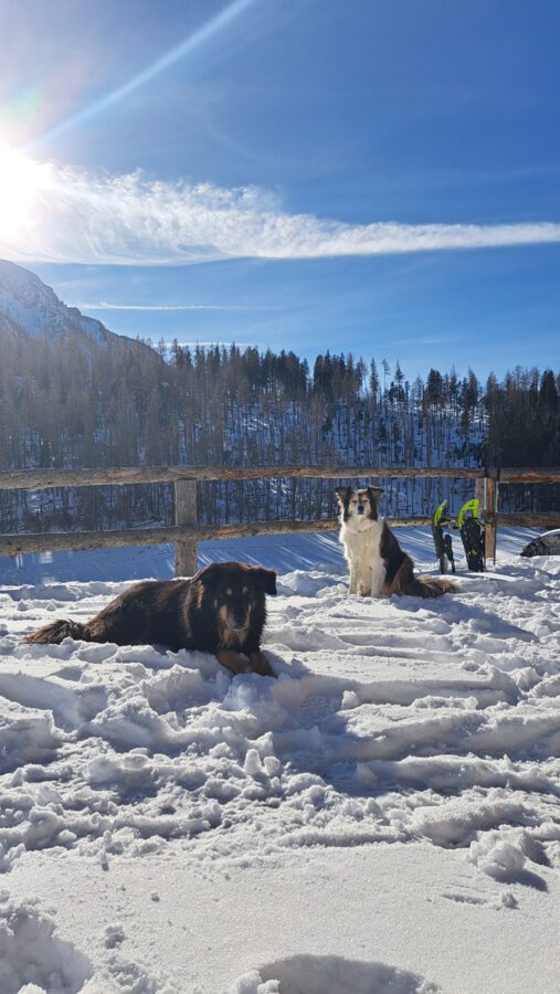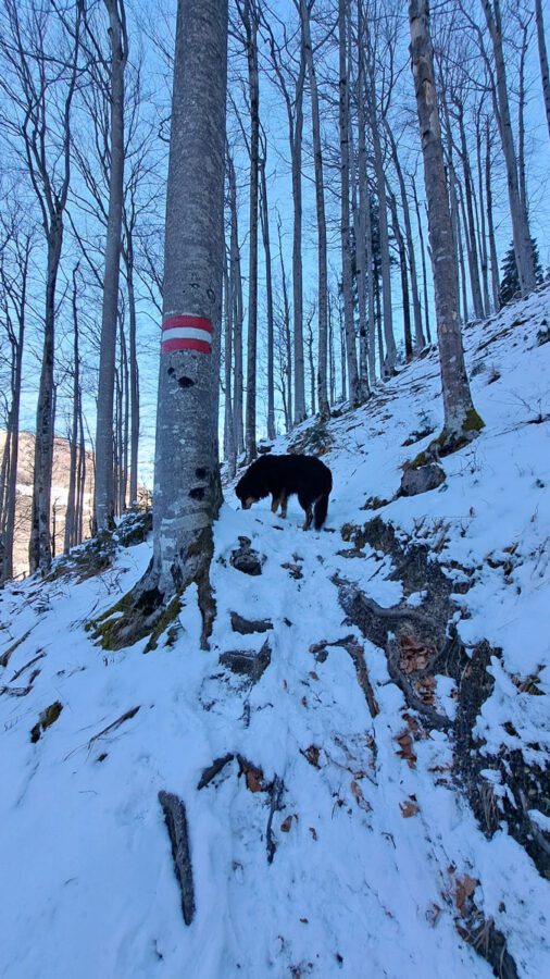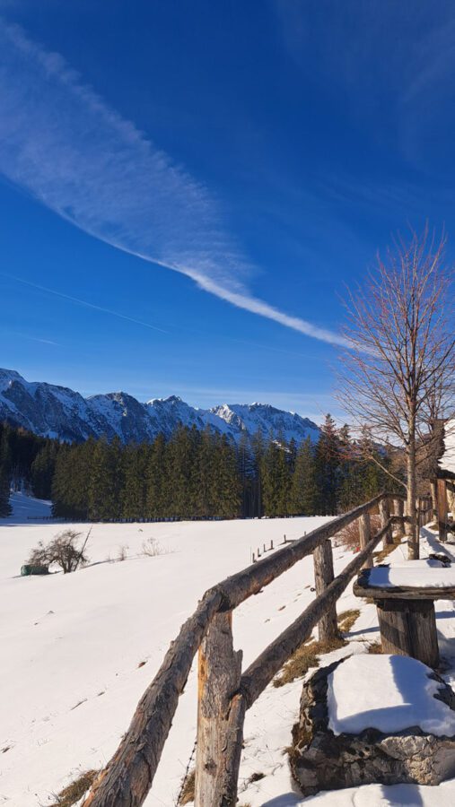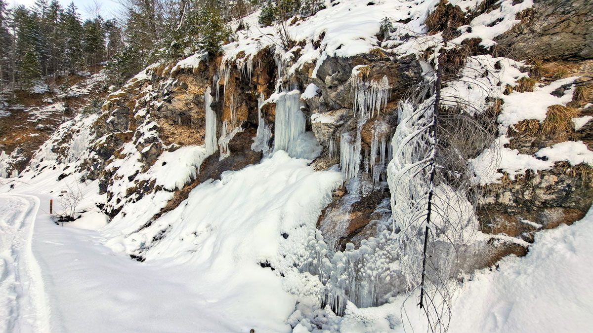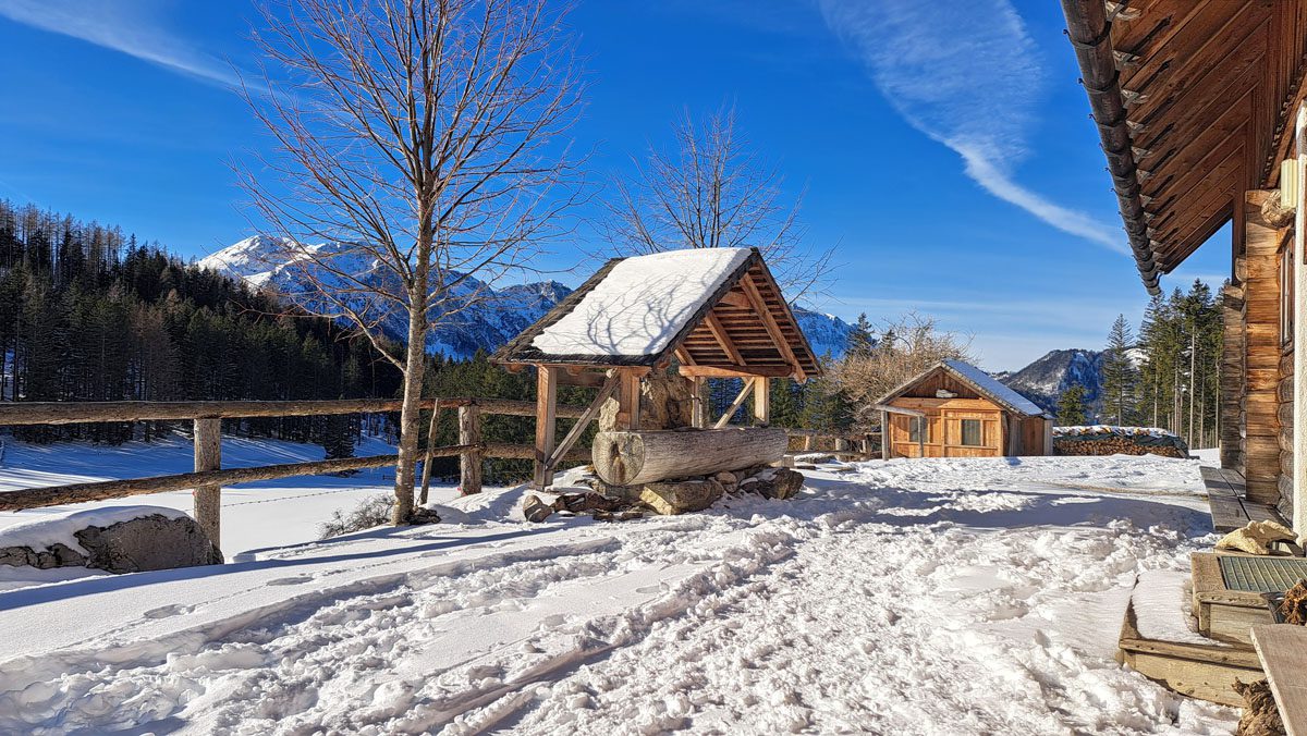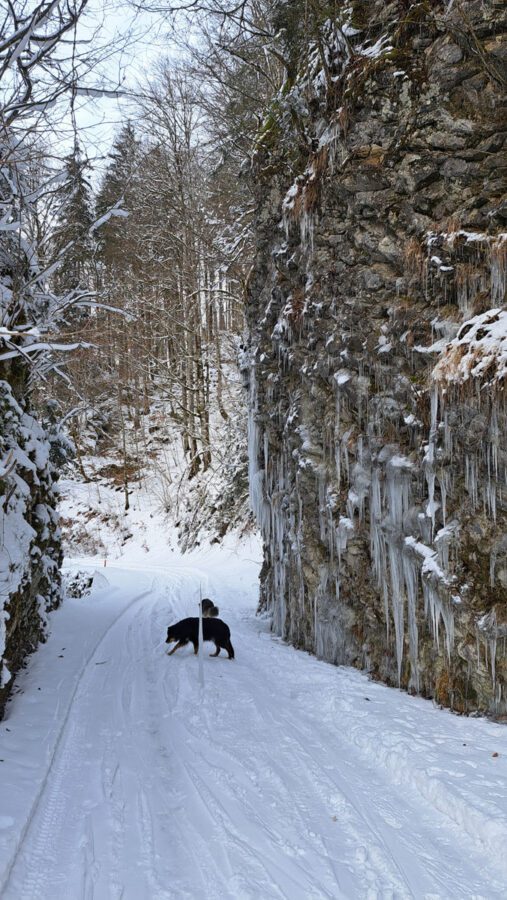 Bergauf wird es schnell warm, logisch, und die Sonne merken wir auch bald. Mit den Schneeschuhen (Ernst mit den Schiern) zuerst über den Steig und dann über die Forststraße bis zur Almhütte ist es eine sehr, sehr angenehme Wanderung.
