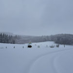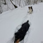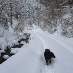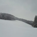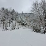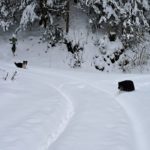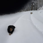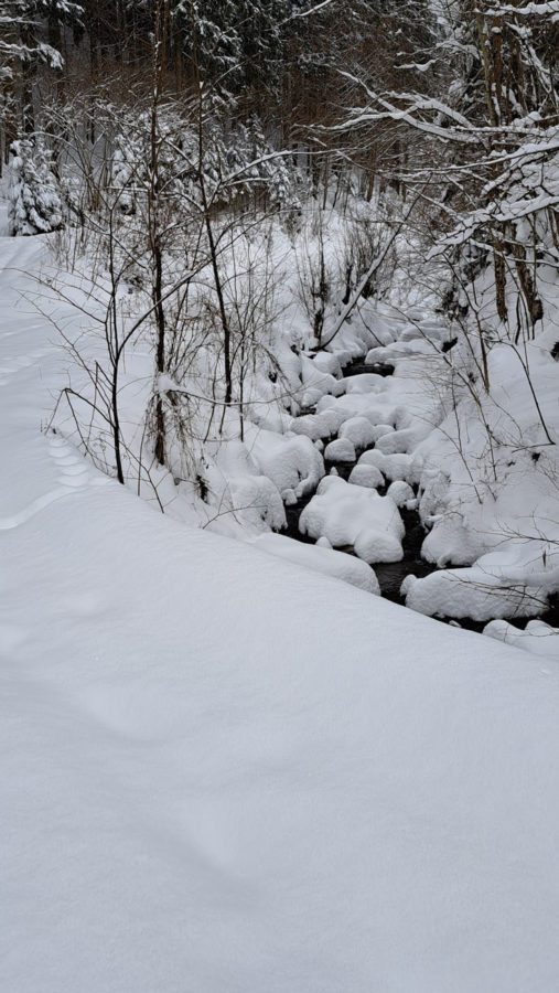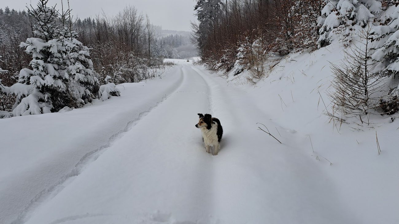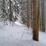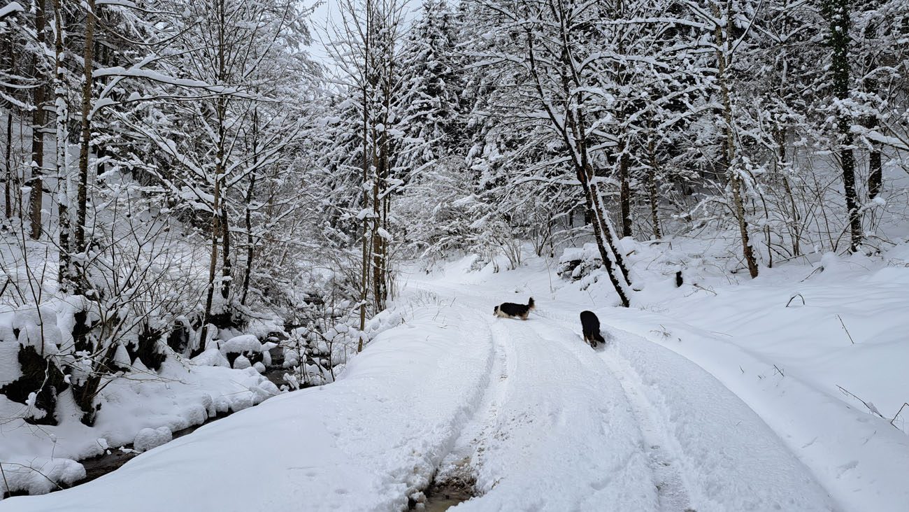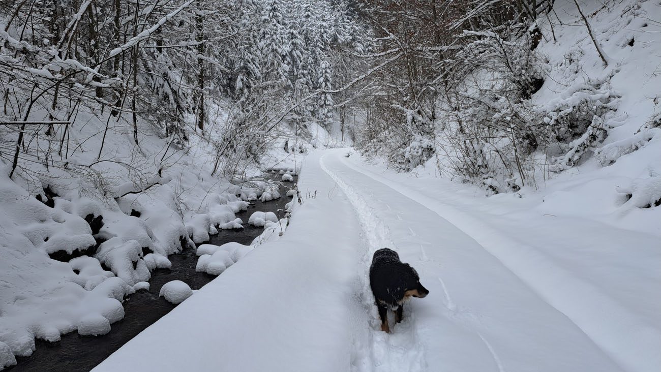 Wir drehen eine Runde und haben auf der ganzen Strecke Tiefschnee. Weil das mit der Zeit doch recht anstrengend wird (geschätzte 50 cm Fast-Pulverschnee), nutzen wir oft die Schneeschuh-Spur hinterm Herrl. Der hat längere Beine, der kommt besser durch 🙂