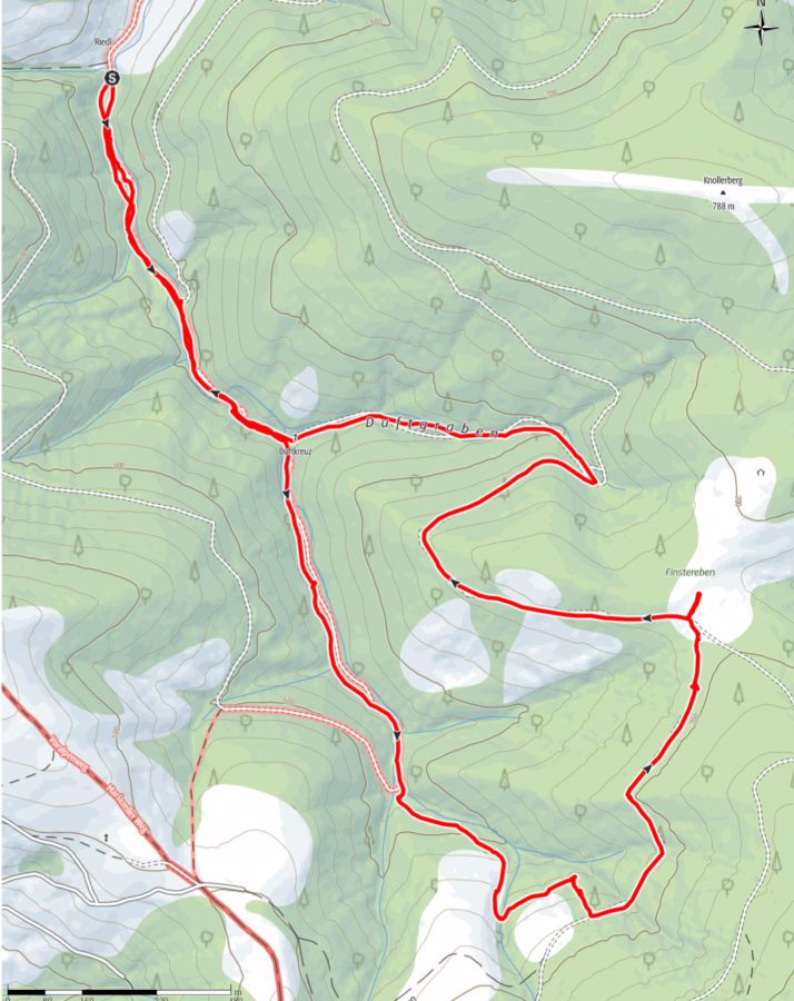 Weil man heute die meisten Pfade sowieso nicht sieht, wandern wir einfach quer durch die Landschaft und nur dort, wo es gar nicht anders geht, auf einer verschneiten Forststraße.