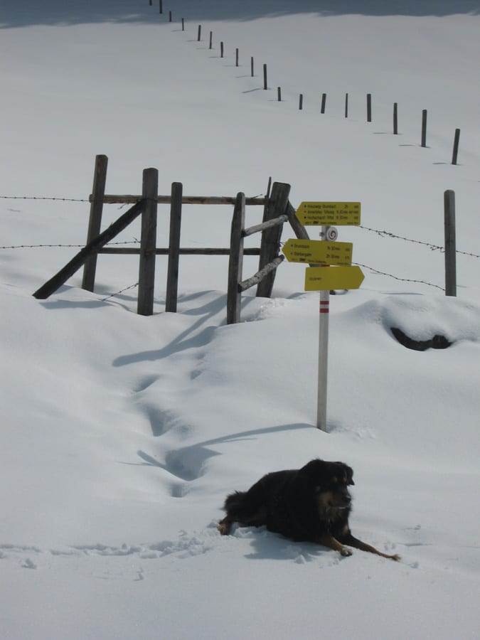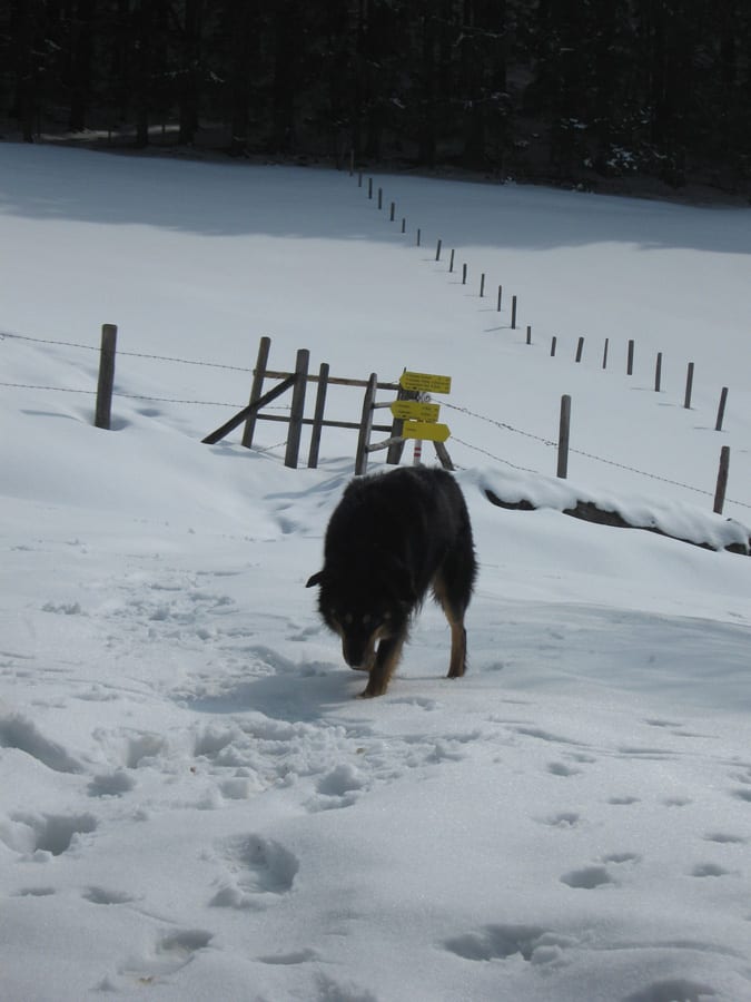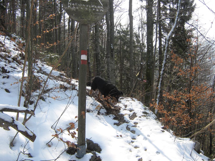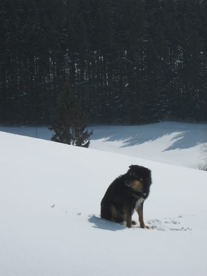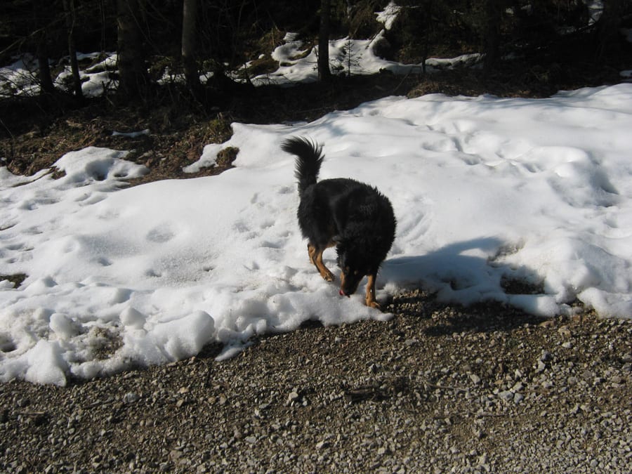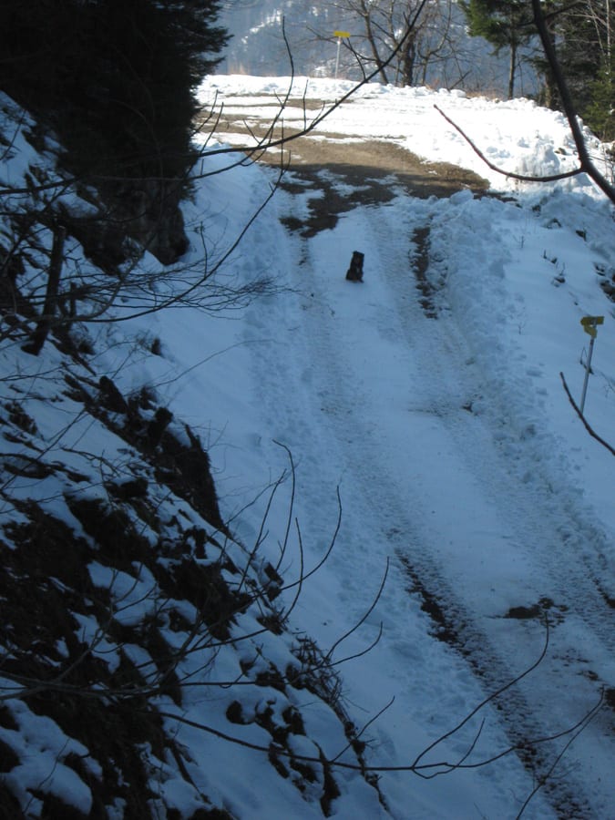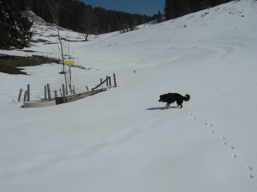 Den ersten Teil des Weges hinunter nach Brunnbach gehen durch den Wald. Weil da stellenweise tiefer Schnee und stellenweise gar keiner mehr liegt gehen wir die ganze Strecke neben der Spur ( …. was? „neben der Spur“ heisst ganz was anderes? … ihr Menschen mit euren Redewendungen! …). Da bin stecke ich manchmal bis zur Schulter im Schnee und auch s’Herrl sinkt mit den Schneeschuhen ordentlich ein. Also rüber zur Forststraße dort den Rest zurück bis zur Kutsche.