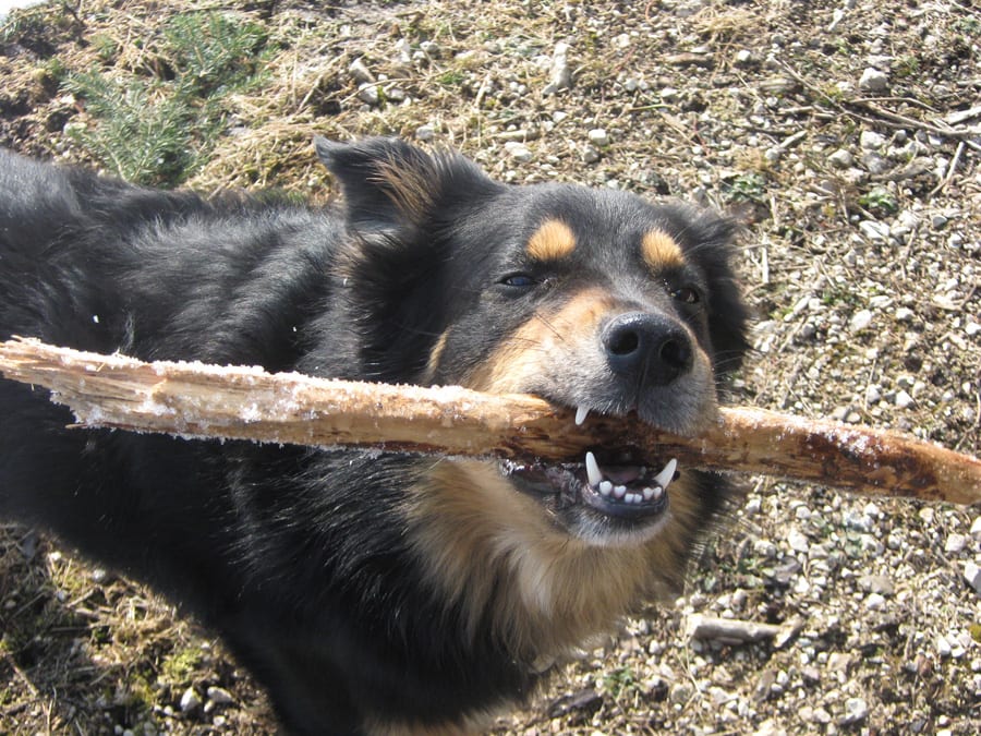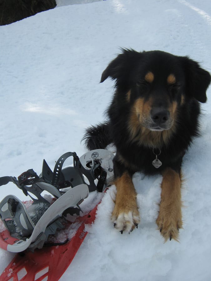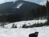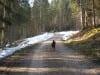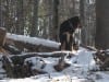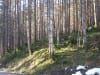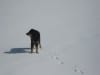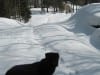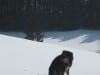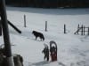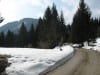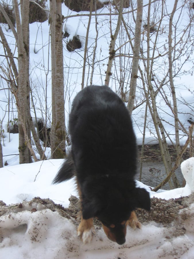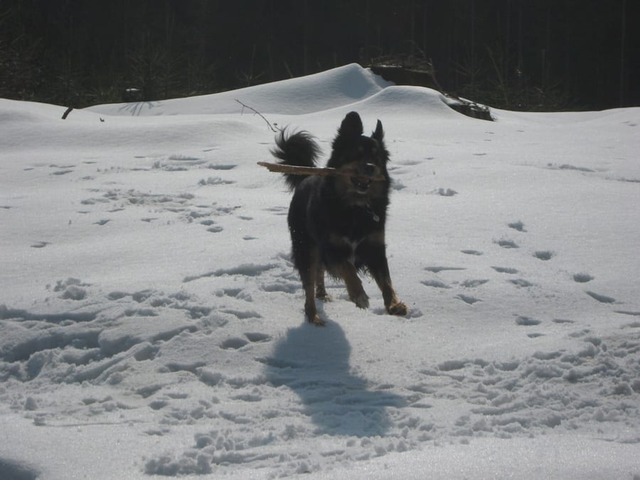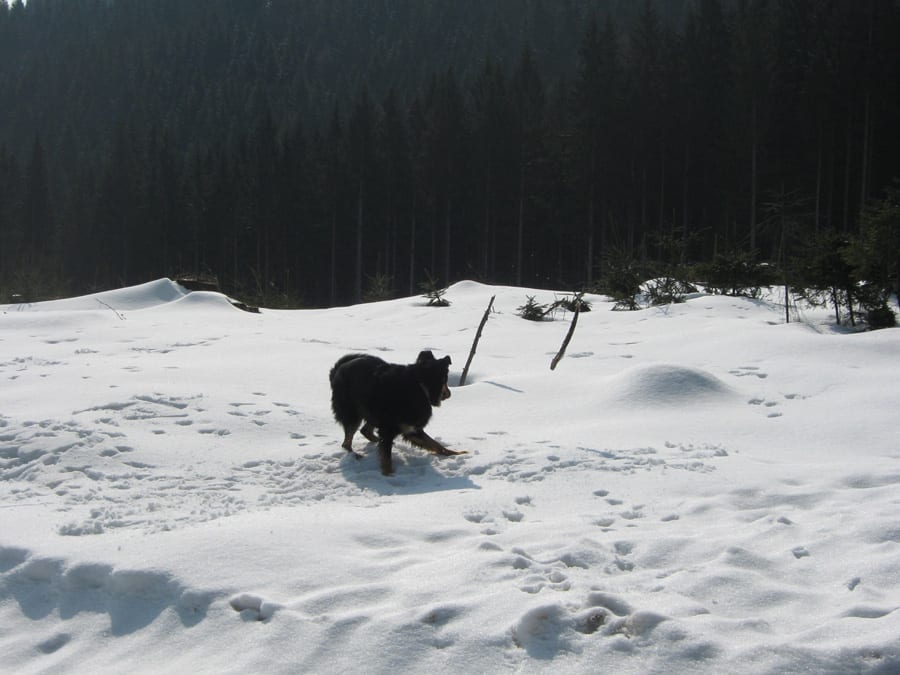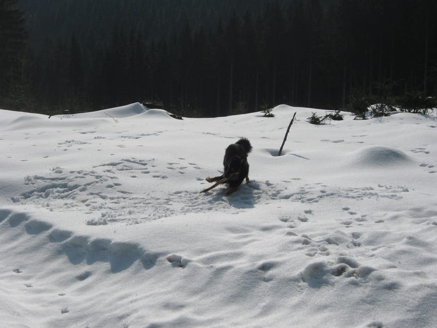 Den ersten Teil des Weges hinunter nach Brunnbach gehen durch den Wald. Weil da stellenweise tiefer Schnee und stellenweise gar keiner mehr liegt gehen wir die ganze Strecke neben der Spur ( …. was? „neben der Spur“ heisst ganz was anderes? … ihr Menschen mit euren Redewendungen! …). Da bin stecke ich manchmal bis zur Schulter im Schnee und auch s’Herrl sinkt mit den Schneeschuhen ordentlich ein. Also rüber zur Forststraße dort den Rest zurück bis zur Kutsche.