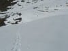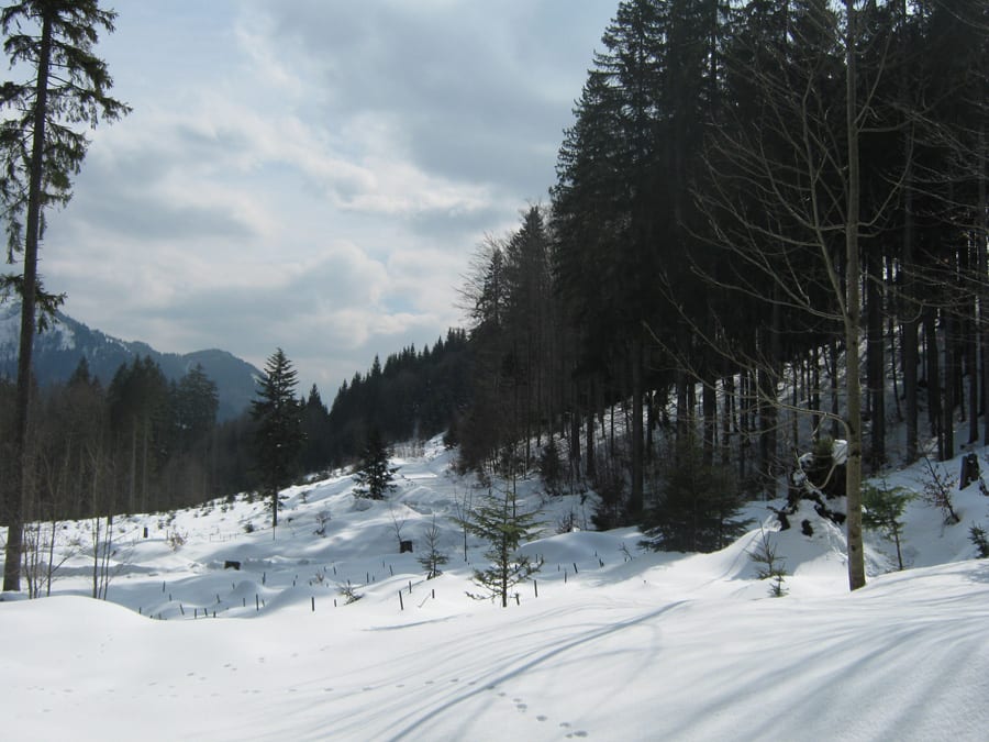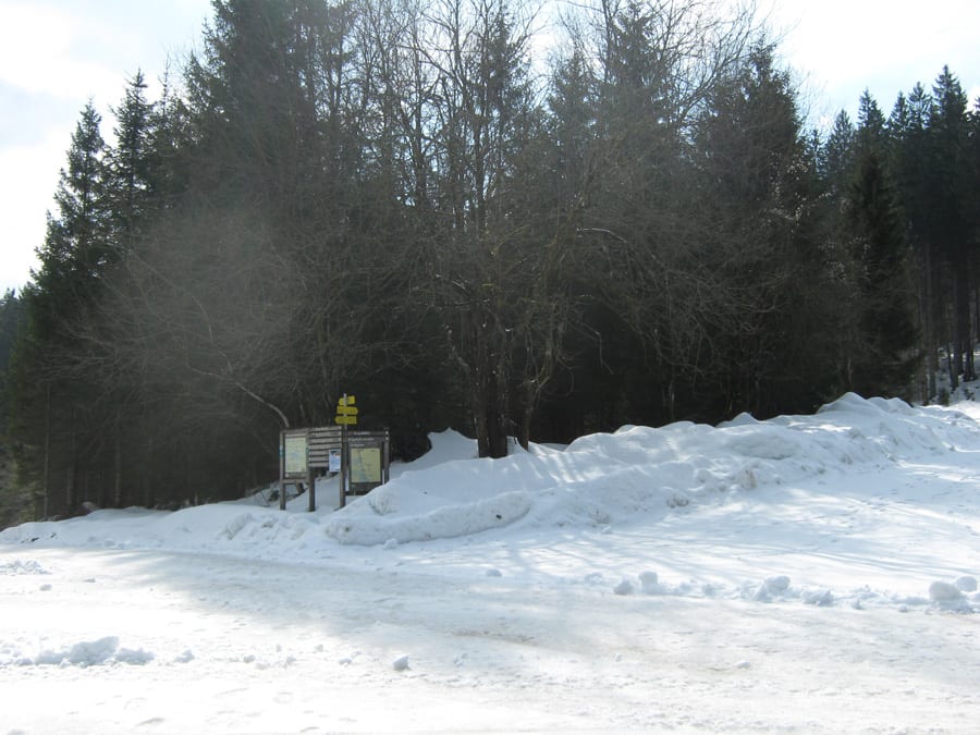 Unten in Brunnbach, beim Schranken, ist kaum mehr Schnee und auch hinauf zu der Ortbaueralm sieht man nicht viel davon. Wir wandern über den Radweg hinauf, weil heute ist nicht mit Radfaher-Verkehr zu rechnen. Erst bei der Ortbaueralm liegt Schnee und dort sehen wir auch Luchsspuren (aber leider keinen Luchs)