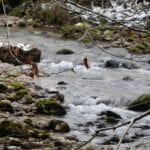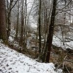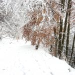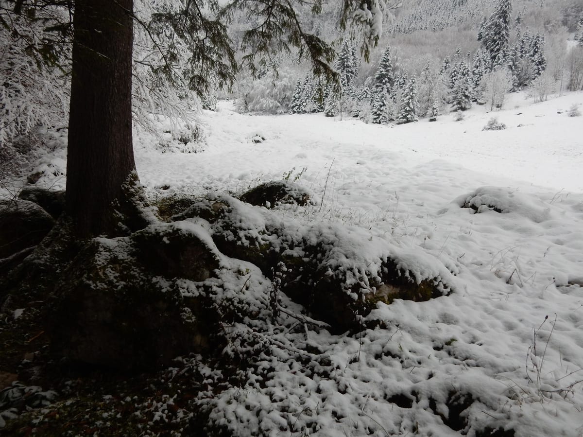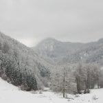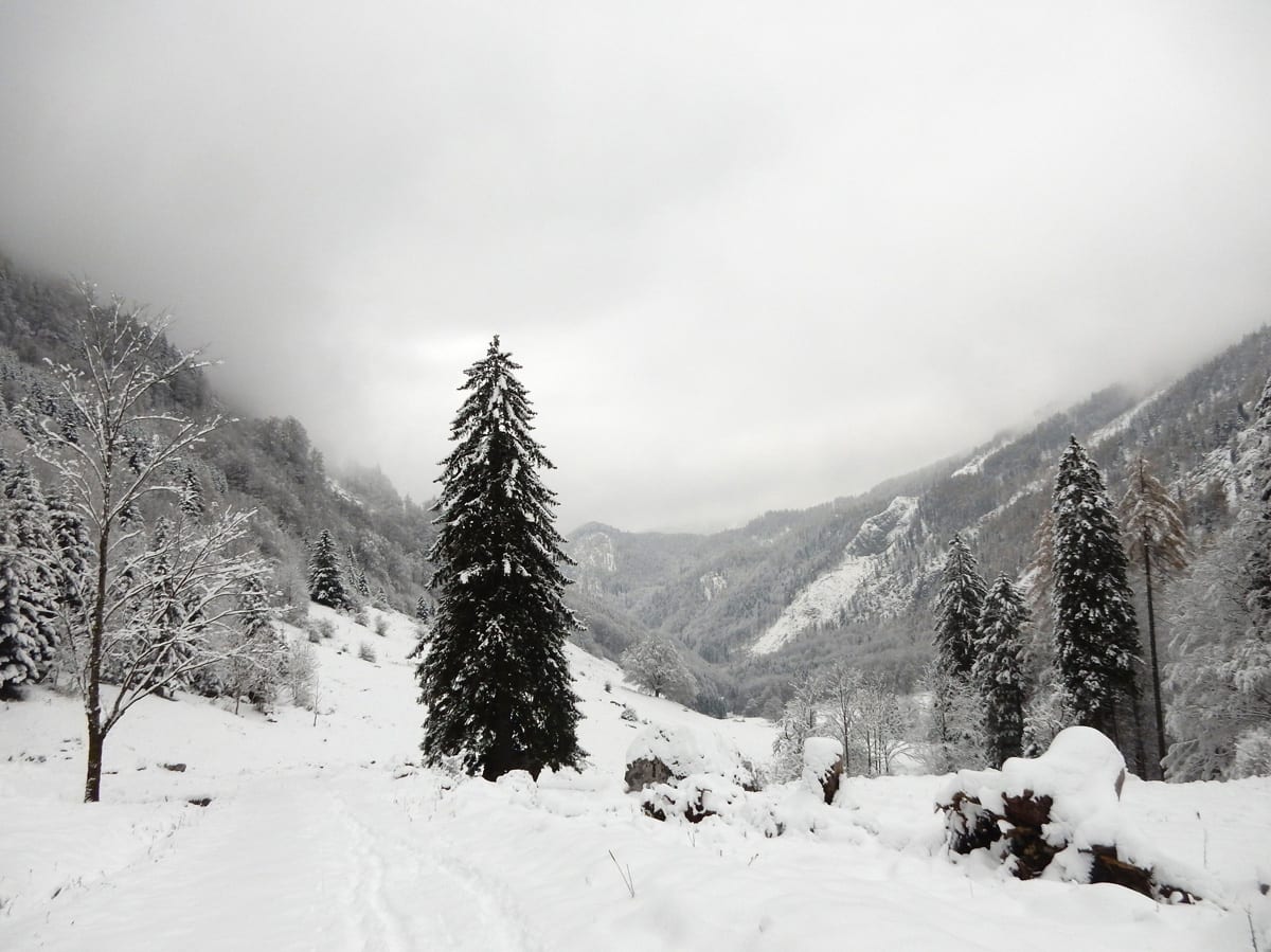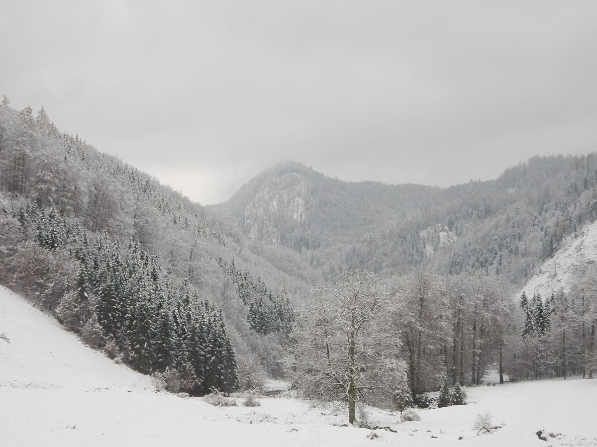 Vom Bodinggraben zur Blumauer Alm und dann bei der Umkehrhütte rechts die Forststraße Richtung Hochsattel so weit es geht hinauf. Das endet bei genau 1.056 Metter Höhe – ab hier ist der Schnee schon wirklich tief und ein Mensch so ganz ohne Schneeschuhe kommt da ziemlich ins Schnaufen. Leider ist das nicht hoch genug um aus den Wolken heraus zu kommen; so bleibt es eine sonnenlose Wanderung.