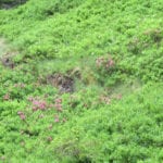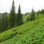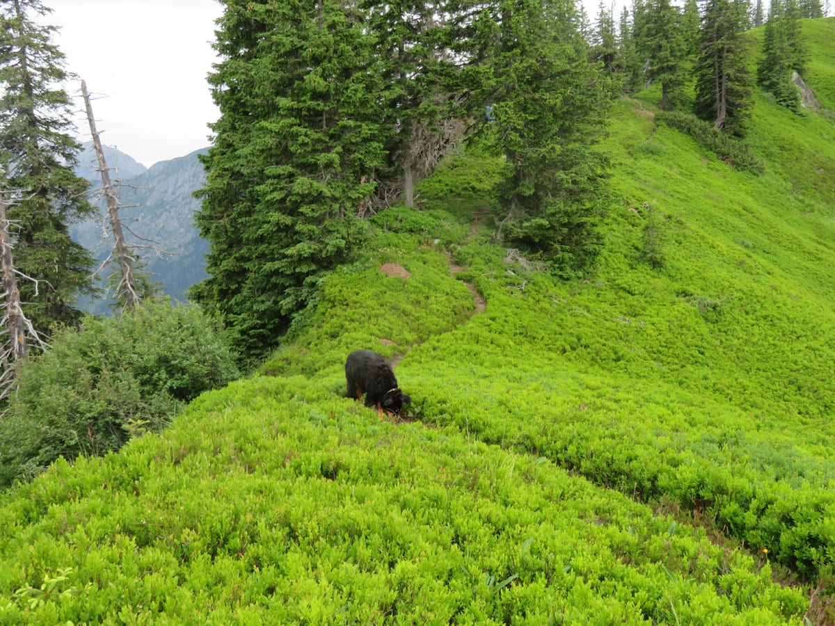 Schon hier auf der Alm beginnt das riesige Heidelbeer-Preiselbeer-Feld, das sich über den ganzen Berg zieht – so weit das Auge reicht, kilometerweit und fast zwei Stunden lang. Das wird in ein paar Wochen ein richtiges Paradies für Beerenfreunde!