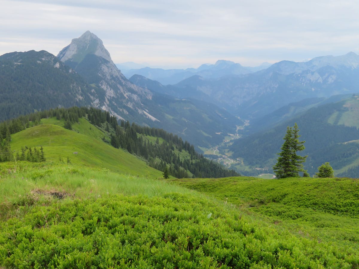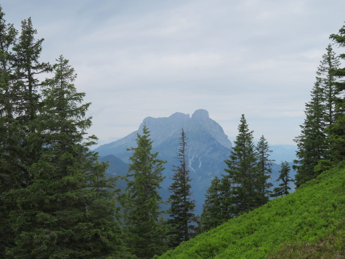 Vom Gescheidegg-Gipfel (1.788m) gibt es Ausblick in alle Richtungen, ein tolles Panorama. Die Wolken sind auch ein bisserl lichter geworden, also sehen wir auch recht weit. Gesäuse und Eisenerzer Alpen zum Angreifen, direkter Blick hinunter auf Radmer und Johnsbach und natürlich der spitze Lugauer von allen mäglichen Seiten.