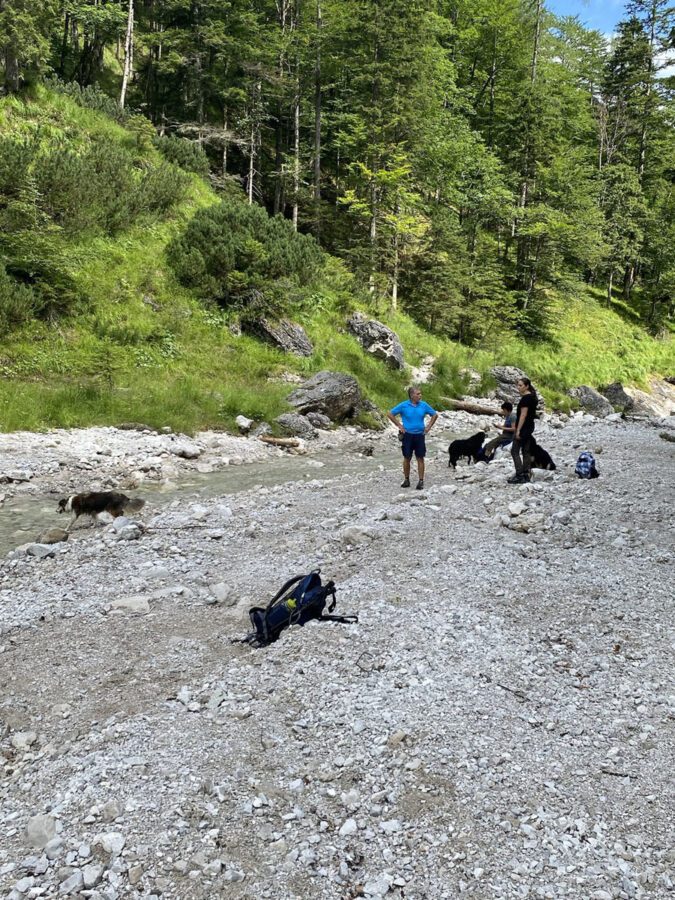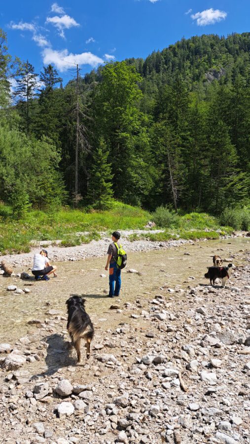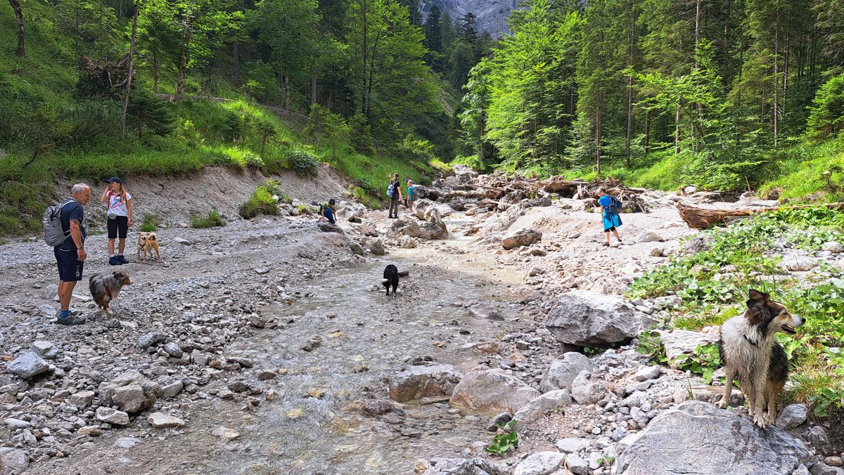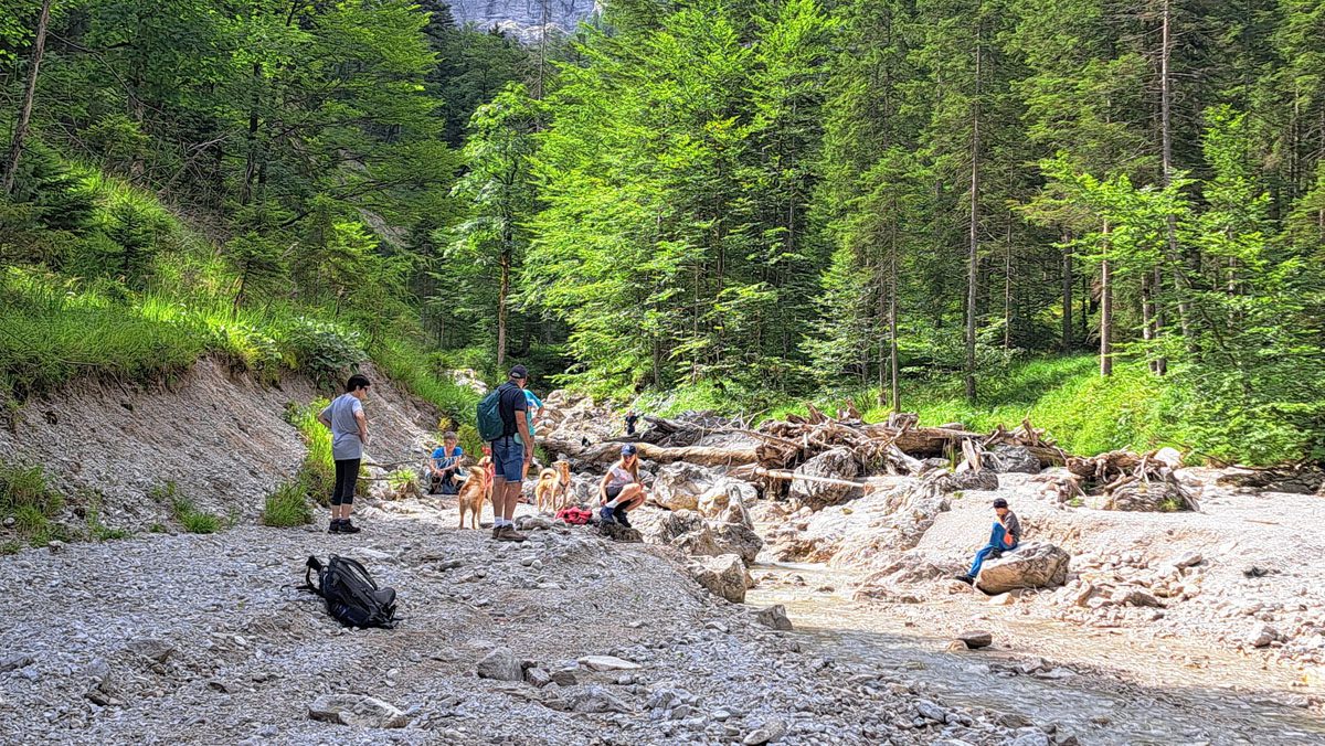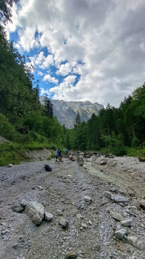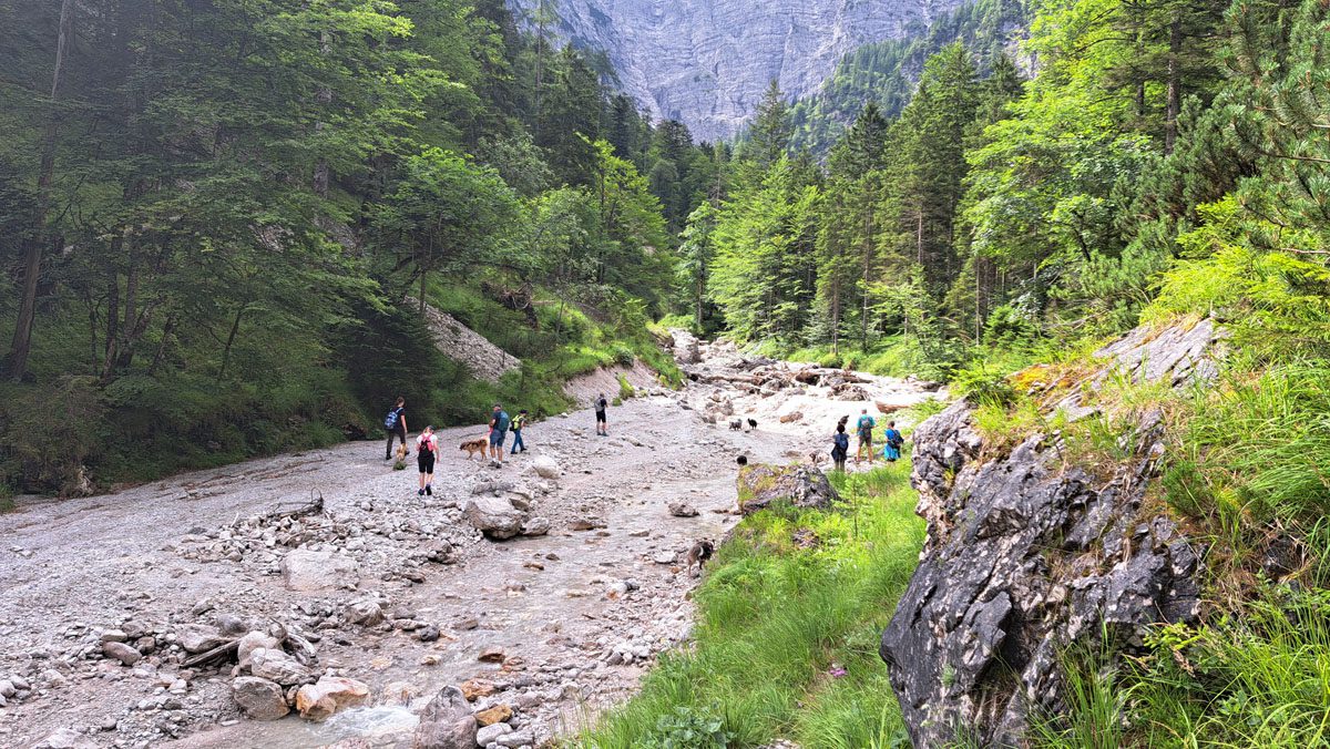 Von der Bernerau spazieren wir zuerst zum Talabschluss beim Weissenbach, der schönste Platz für eine Pause überhaupt (finde ich)! Ein Stück zurück auf demselben Weg, den wir hergekommen sind, bis dorthin, von wo links der Hungeraubach über den Schotter heran fließt. Dort, vor uns, liegt der zweite Talabschluss – anders, aber genauso schön und wieder ein optimaler Rastplatz.