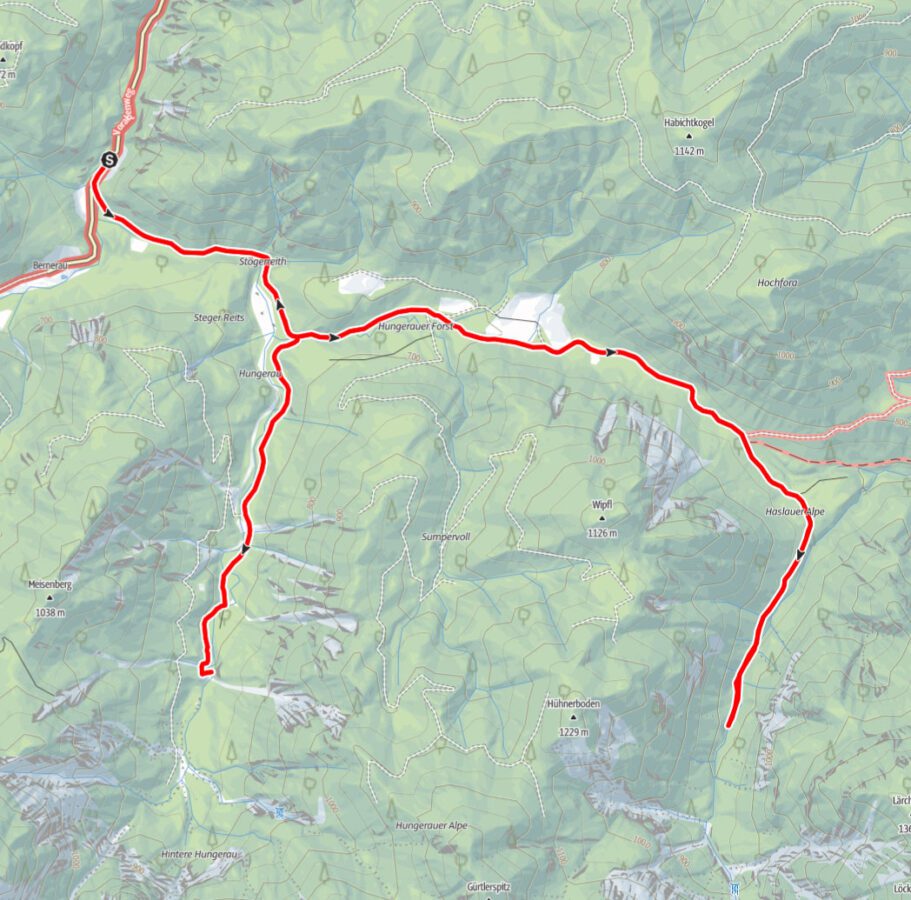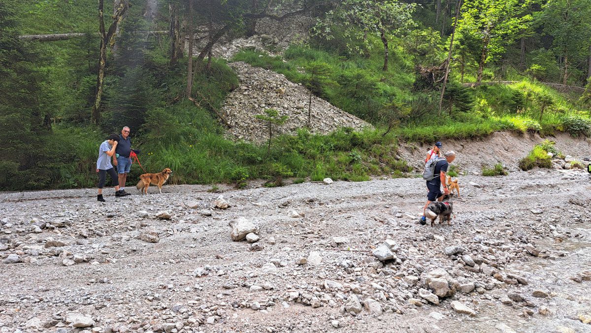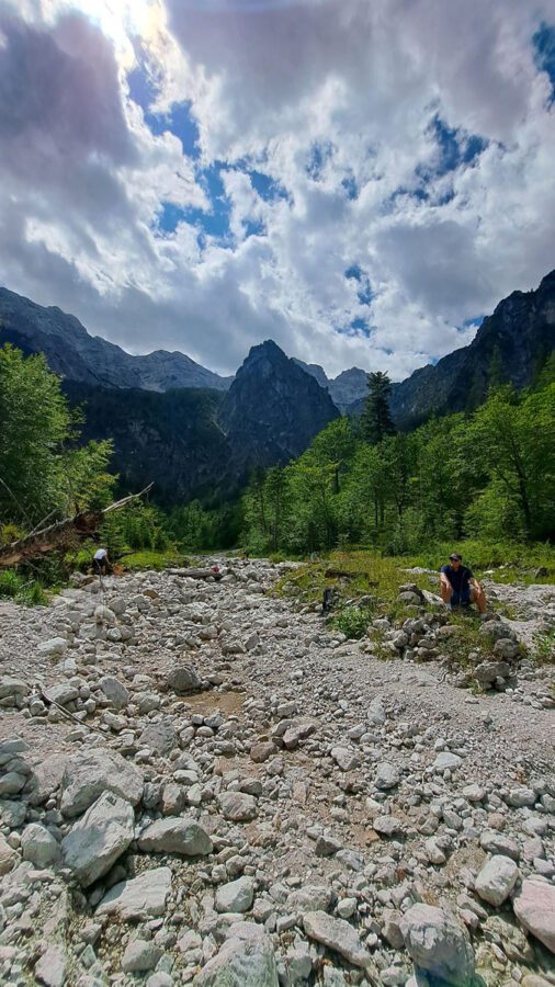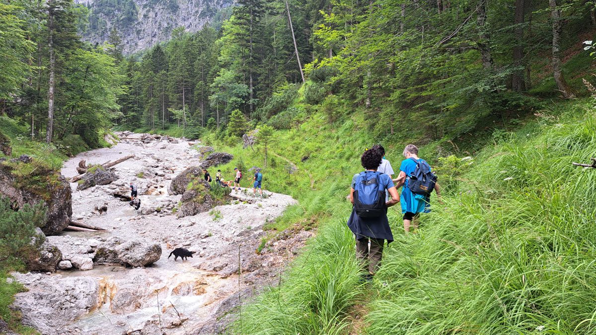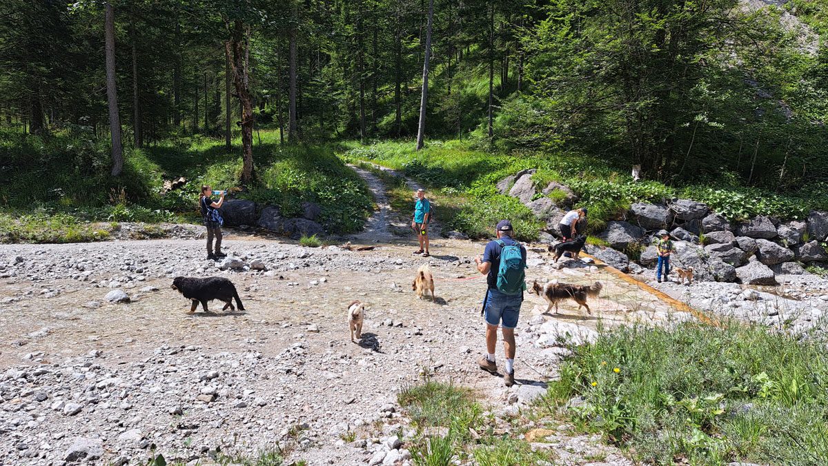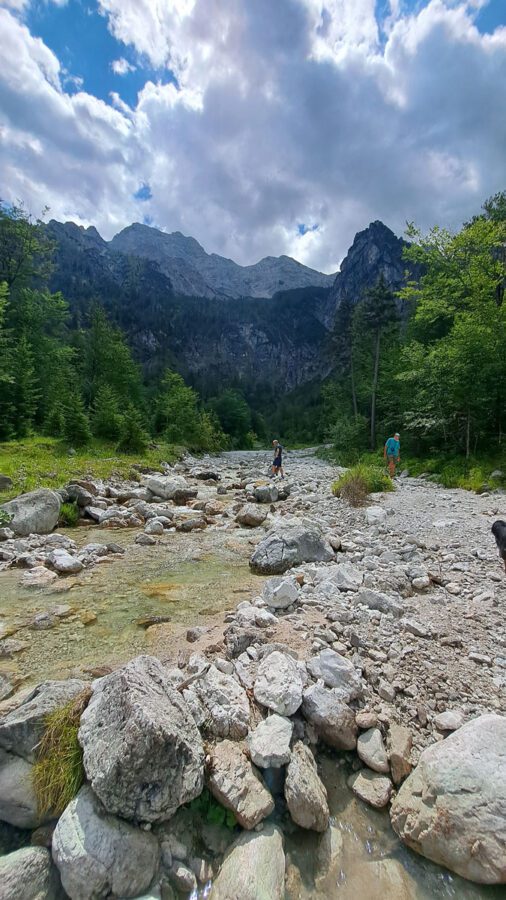 Von der Bernerau spazieren wir zuerst zum Talabschluss beim Weissenbach, der schönste Platz für eine Pause überhaupt (finde ich)! Ein Stück zurück auf demselben Weg, den wir hergekommen sind, bis dorthin, von wo links der Hungeraubach über den Schotter heran fließt. Dort, vor uns, liegt der zweite Talabschluss – anders, aber genauso schön und wieder ein optimaler Rastplatz.