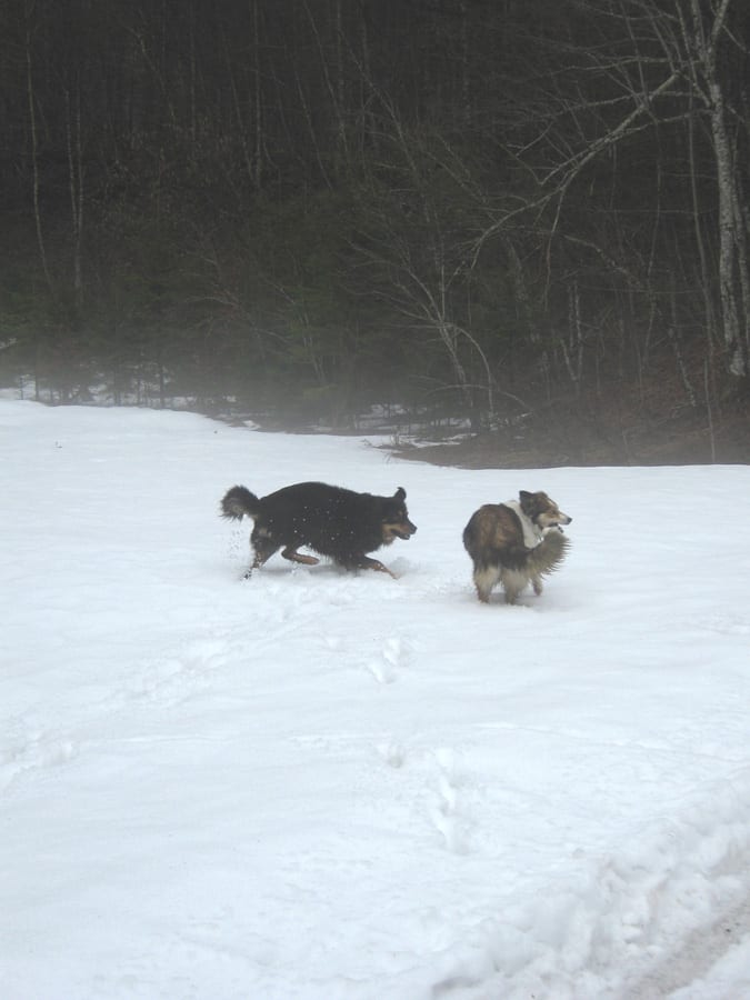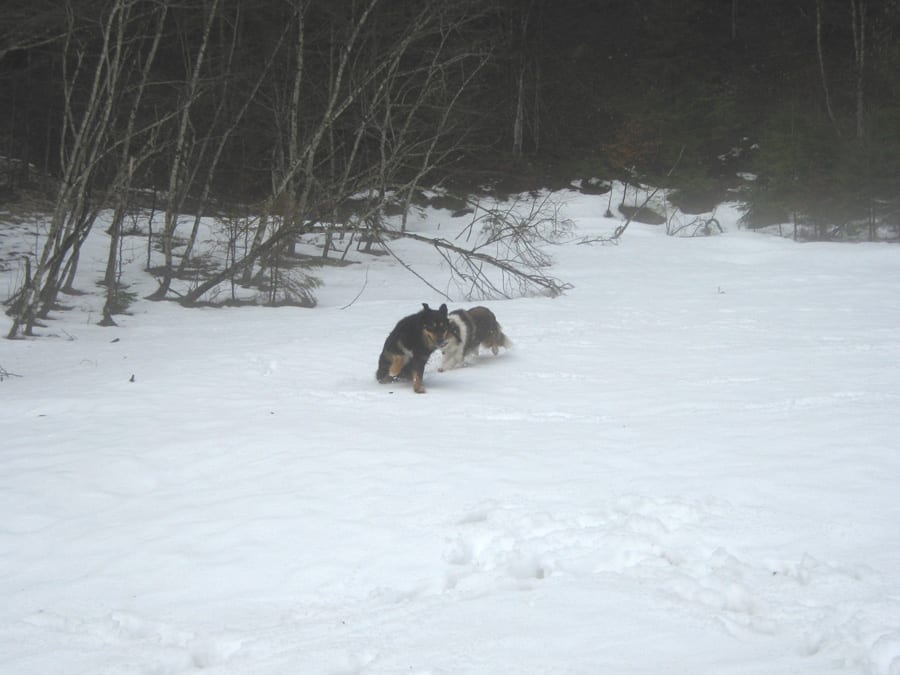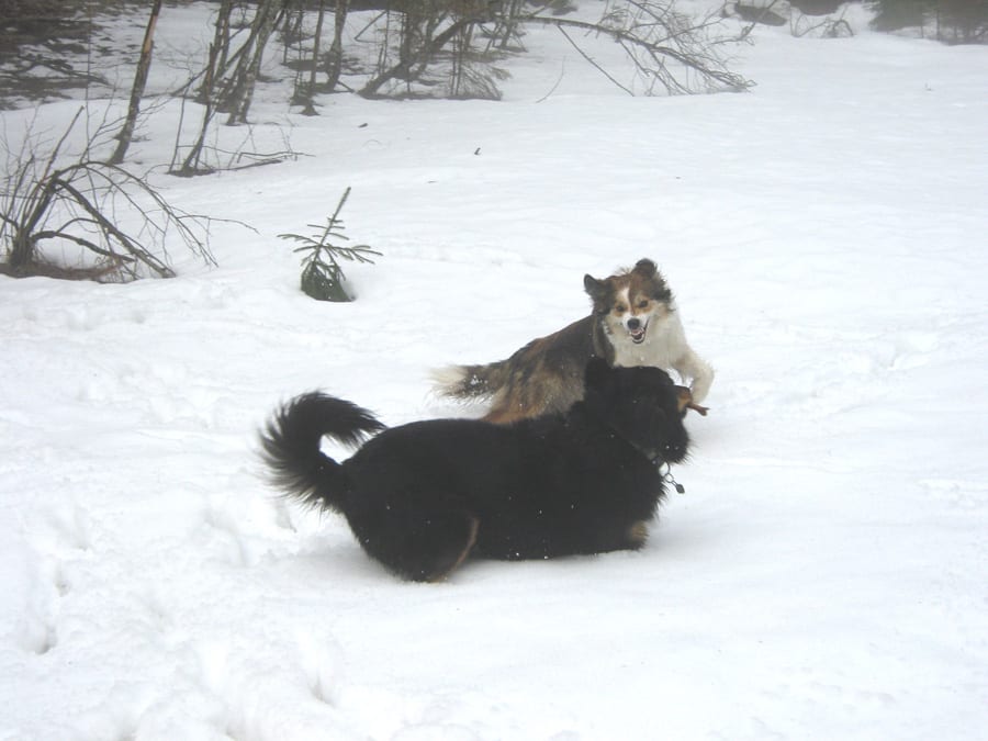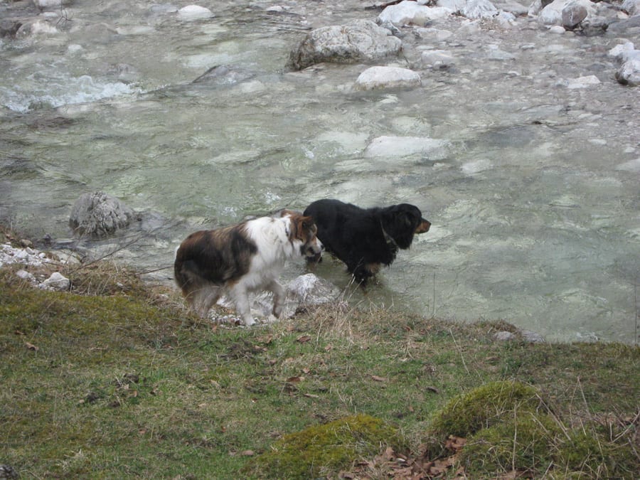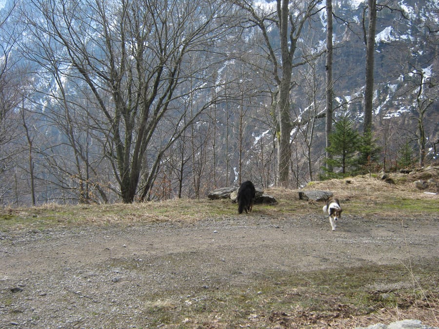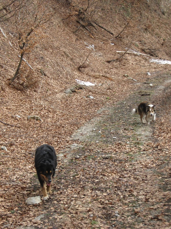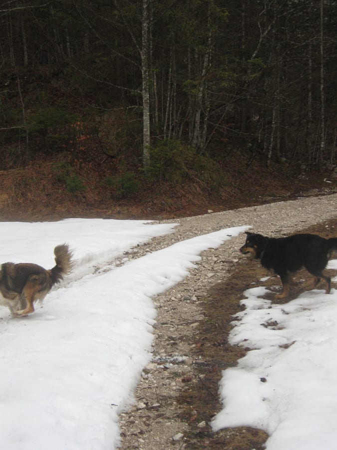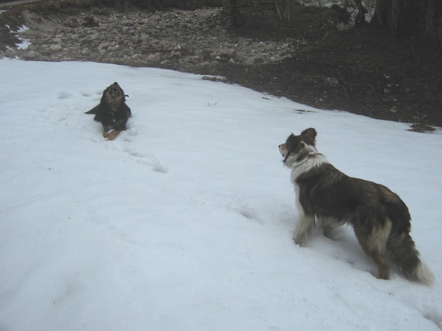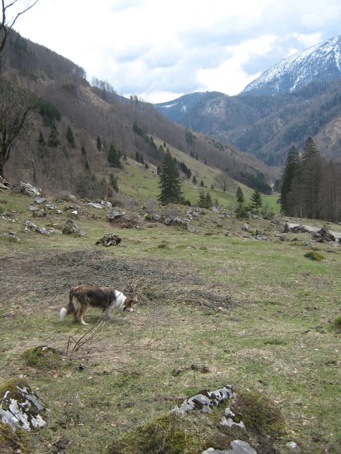 Bis 1.000m hinauf geht es hier gut, aber ab dann liegt auch hier ganz viel Schnee! Kniehoch (und ich meine damit ein Menschenknie) liegt der herum und das scheint für s’Herrl und die Ronja ein bisserl anstrengend zu sein; aber die beiden brauchen sowieso etwas Training …
