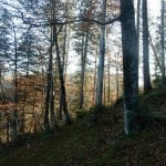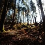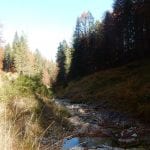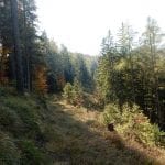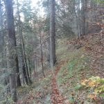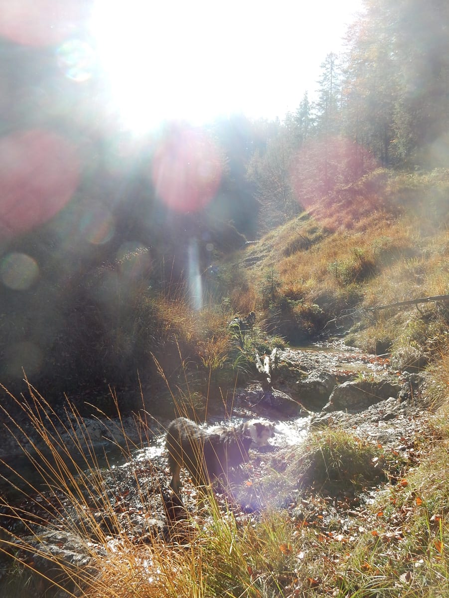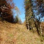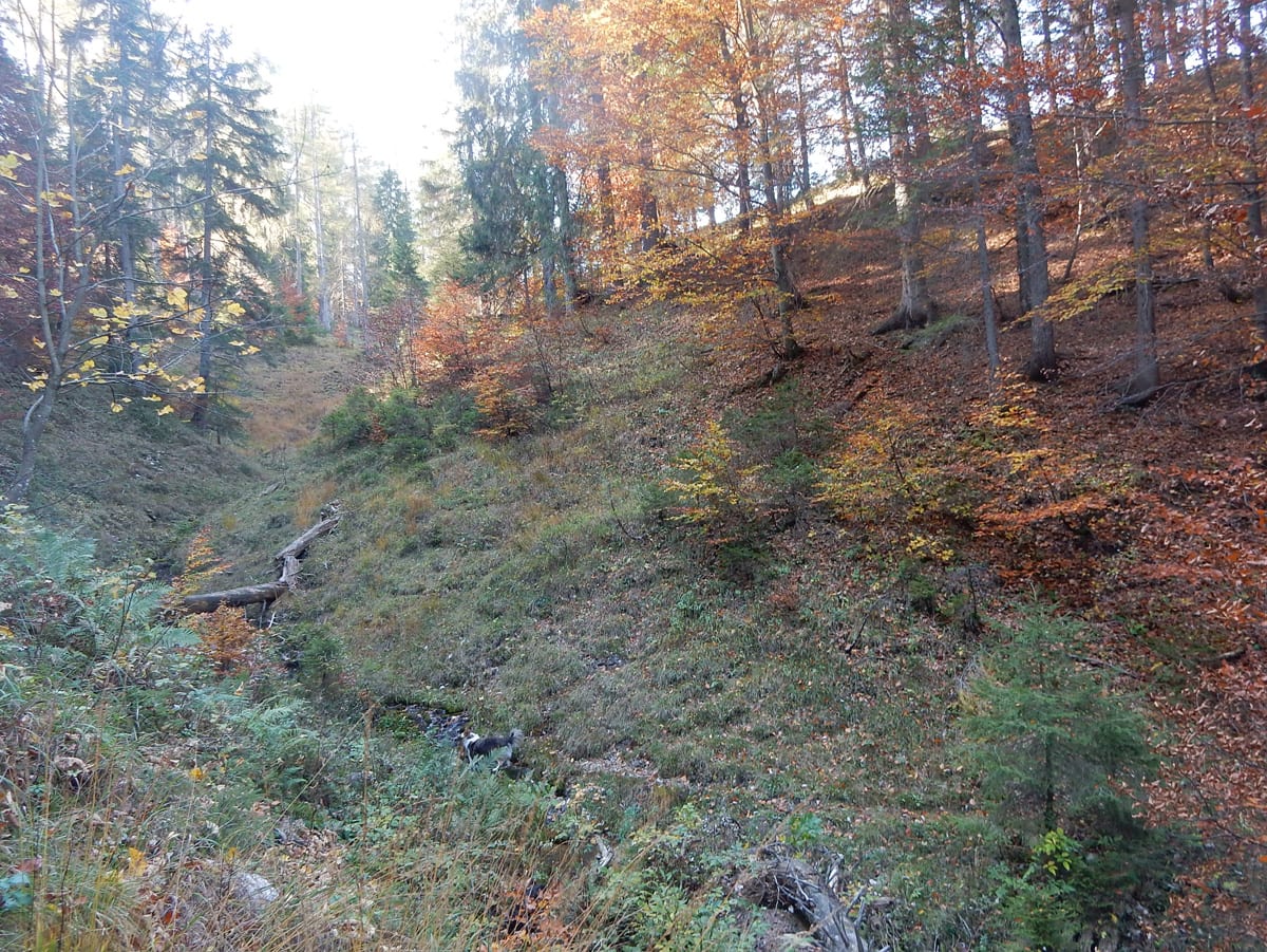 Zuerst den Weg hinunter zur Krummen Steyrling: den finden wir nicht, erst ein ganzes Stück den Weg hinunter treffen wir darauf. Das wirkliche Problem stellt sich dann ein paar Meter oberhalb der Krummen Steyrling. Das letzte Stück des Weges ist fast senkrecht und zu steil (und zu rutschig) fürs Herrl; wir suchen lange nach einem geeigneten Abstieg, finden aber keinen. Also wieder hinauf zur Maierreith. Dort probieren wir ein paar Wege aus, auf der Suche nach dem, der hinauf zur Mountainbikestrecke führt (führen soll). Am Ende wissen wir: hier zeigen die Karten einige Wege und Verbindungen an, die es tatsächlich nicht gibt. Also quer den Berg hinauf, denn wozu braucht man Wege.