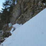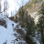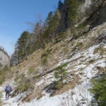 Schon auf der Querung zum Steyrsteg liegen über dem Weg Schneewechten und Lawinenreste. Das lässt sich noch schaffen. Je näher wir aber dem Steyrsteg kommen, desto tiefer wird der Schnee und dann sind es mindestens 50 cm, meistens mehr.