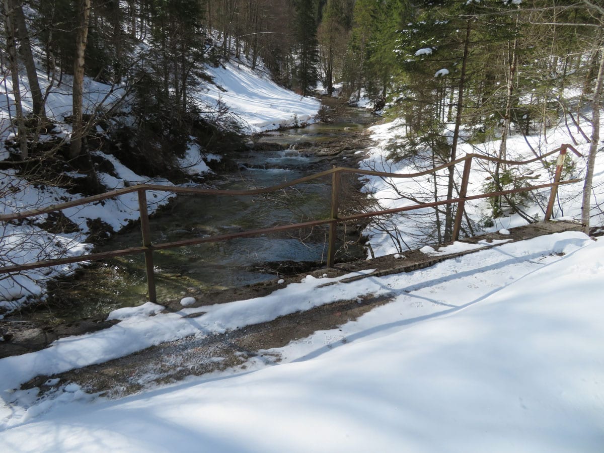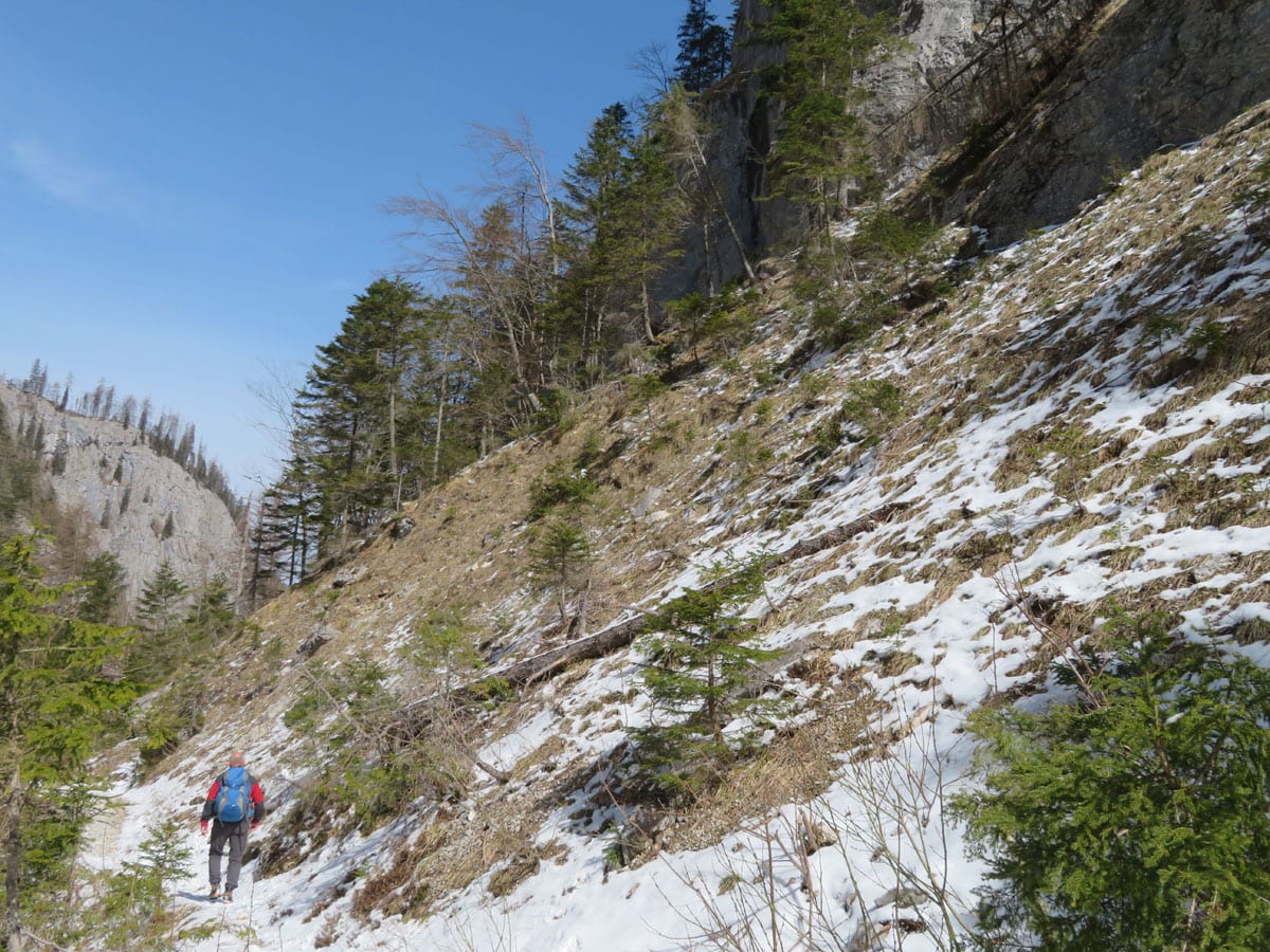 Schon auf der Querung zum Steyrsteg liegen über dem Weg Schneewechten und Lawinenreste. Das lässt sich noch schaffen. Je näher wir aber dem Steyrsteg kommen, desto tiefer wird der Schnee und dann sind es mindestens 50 cm, meistens mehr.