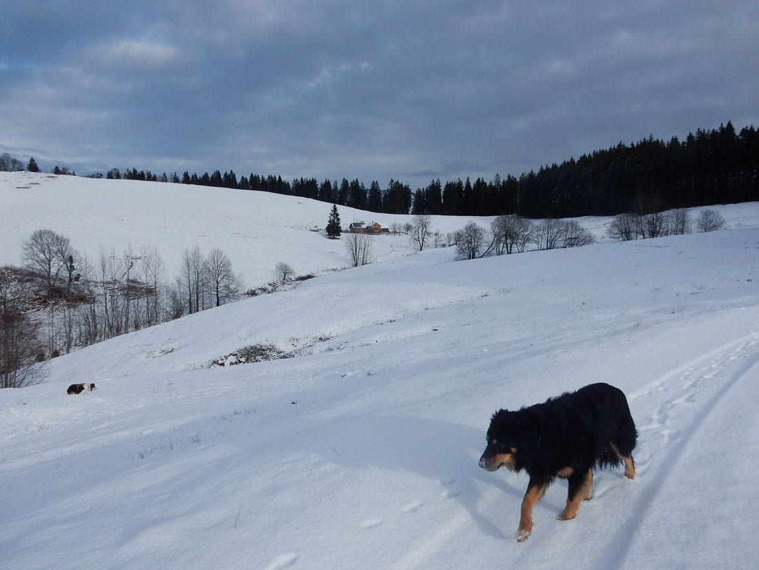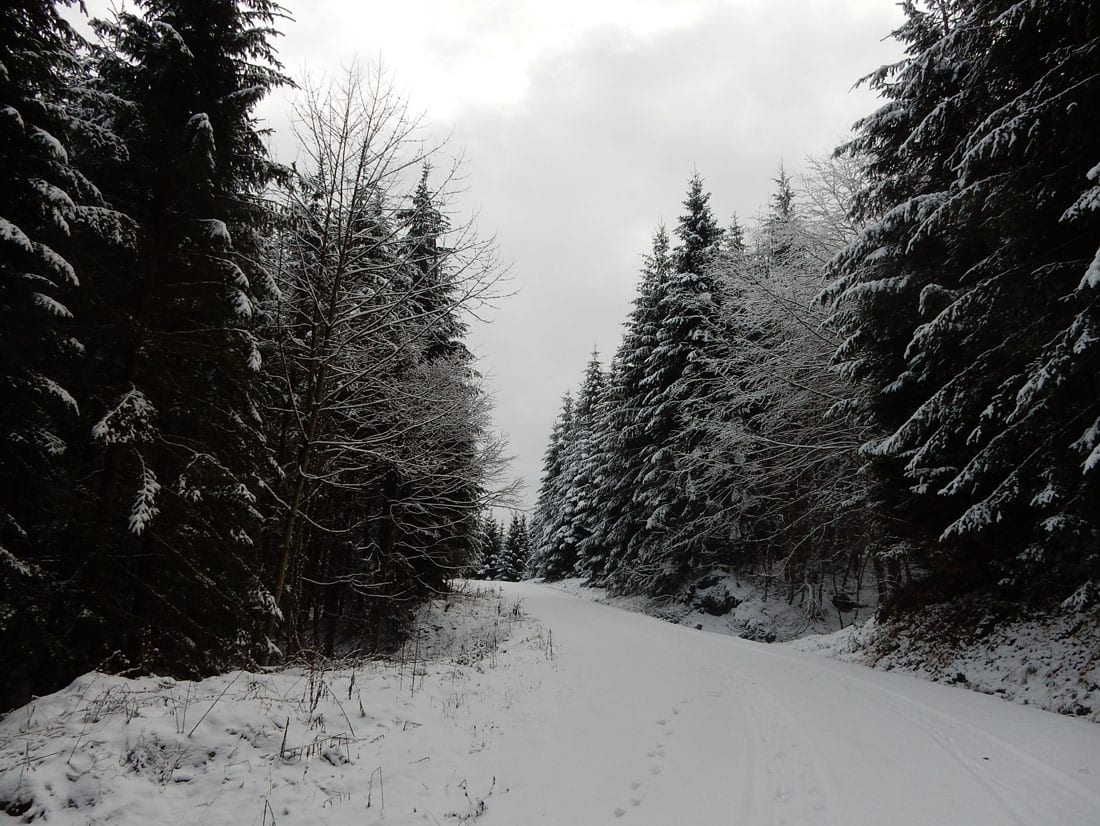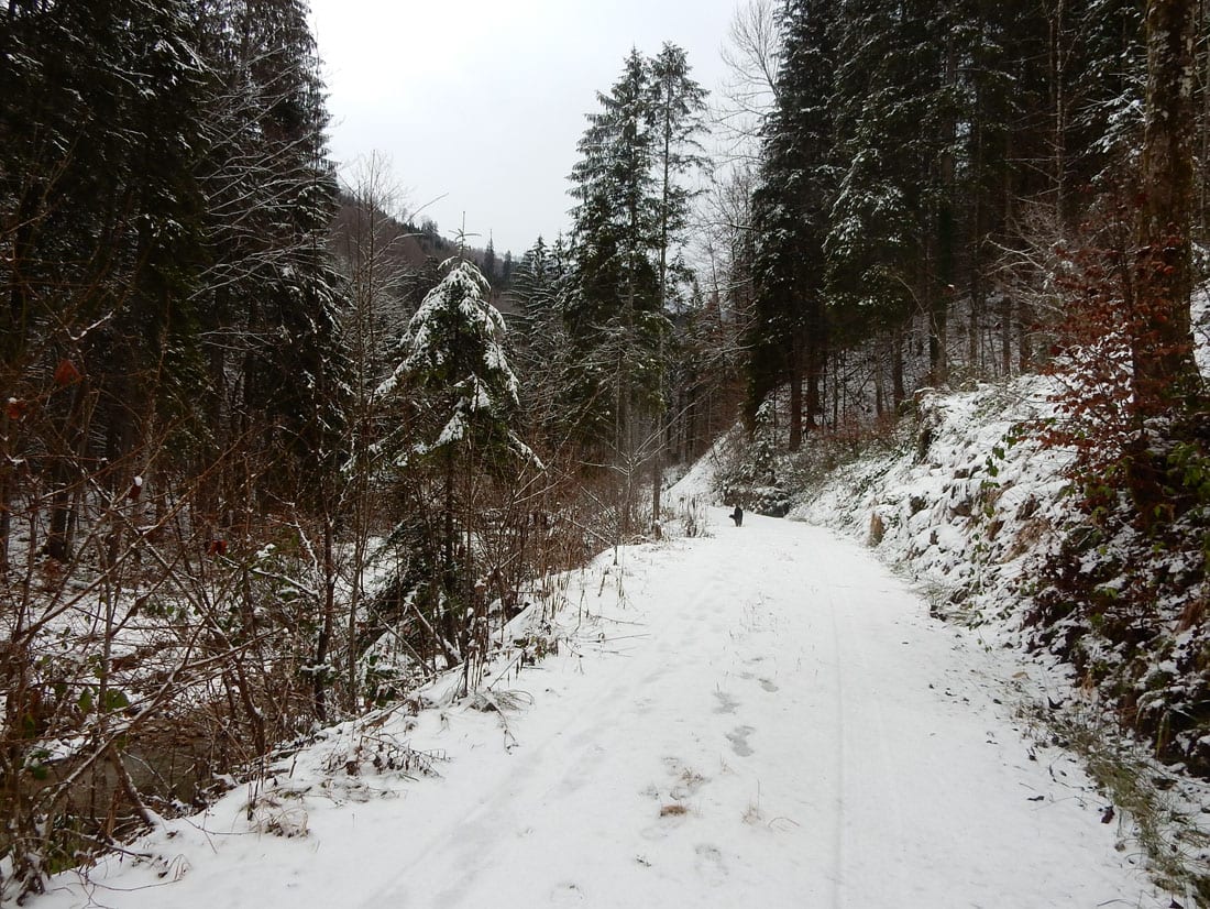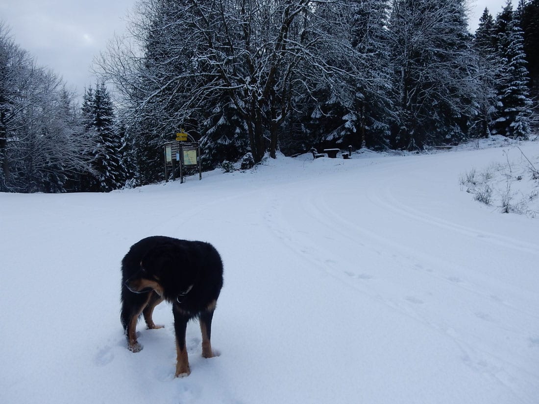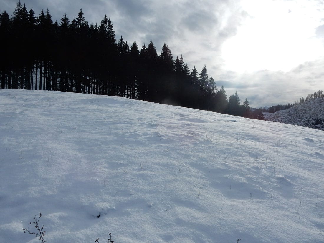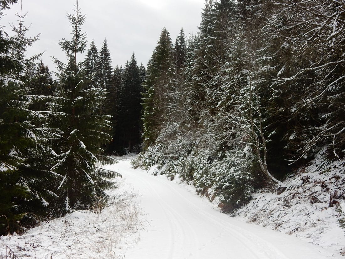 Nicht gerade tiefster Winter aber Winter – ein paar Zentimeter liegen überall, auf den Freiflächen etwas mehr, im Wald etwas weniger.