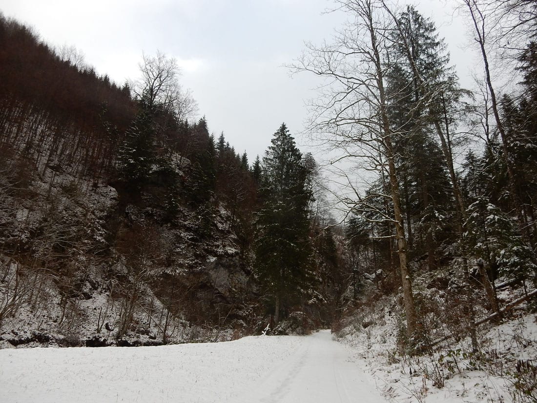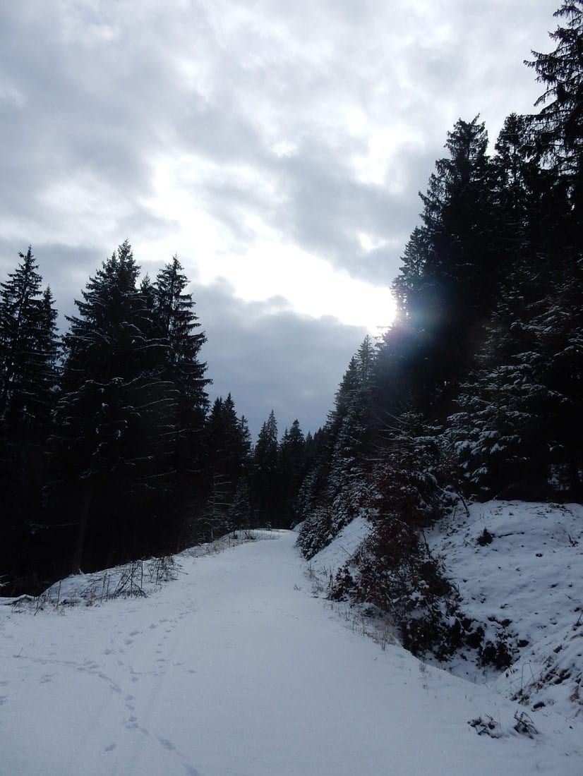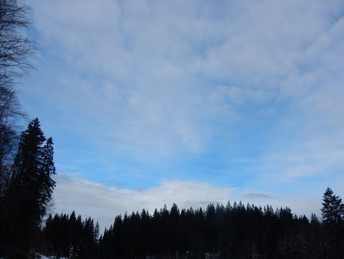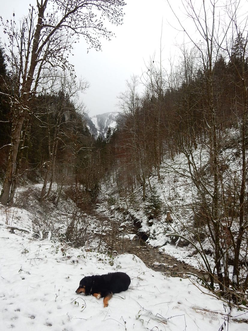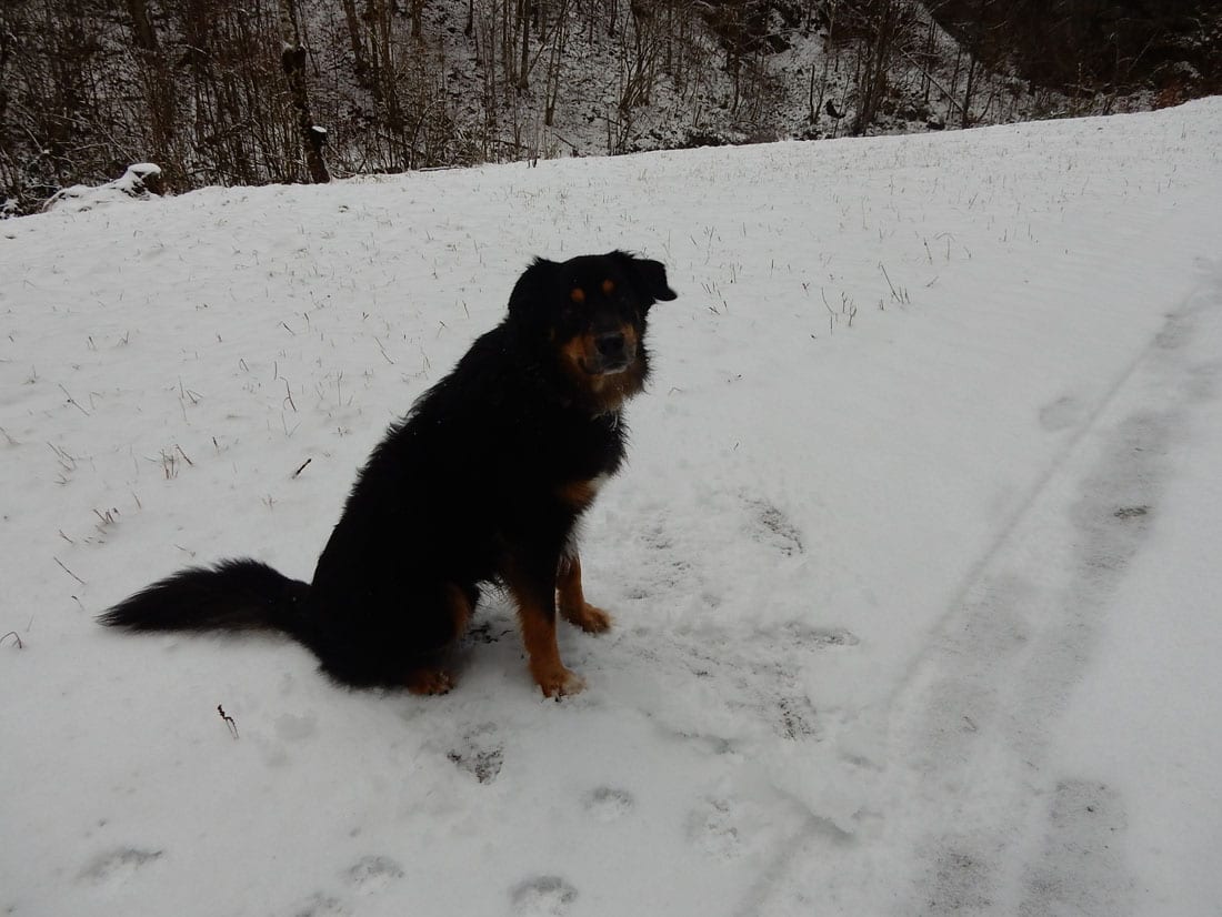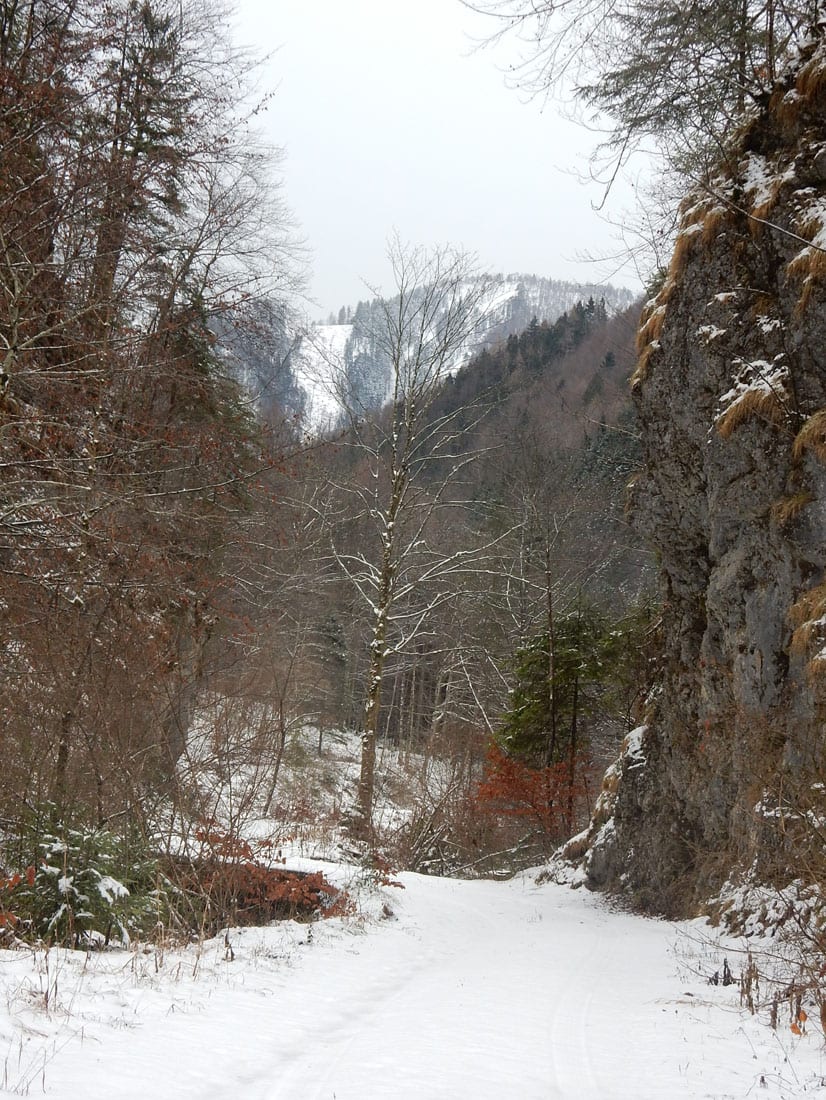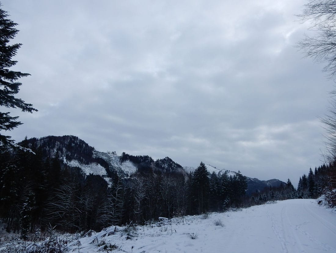 Nicht gerade tiefster Winter aber Winter – ein paar Zentimeter liegen überall, auf den Freiflächen etwas mehr, im Wald etwas weniger.