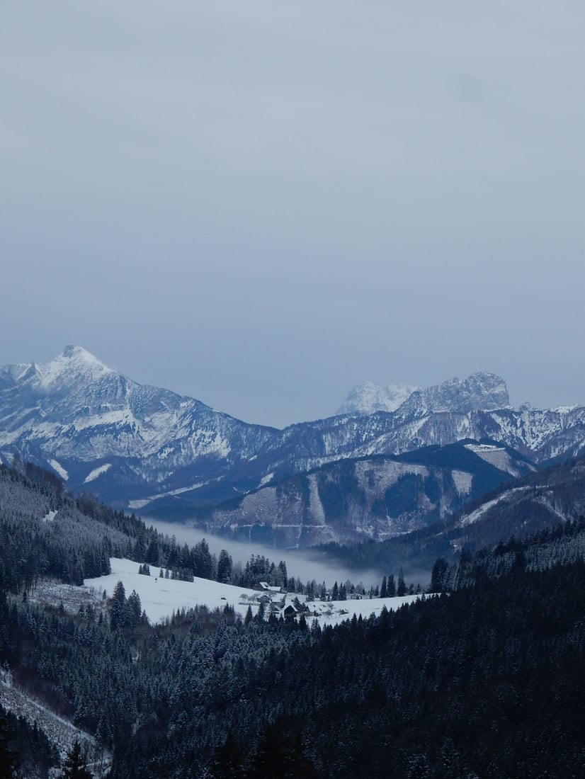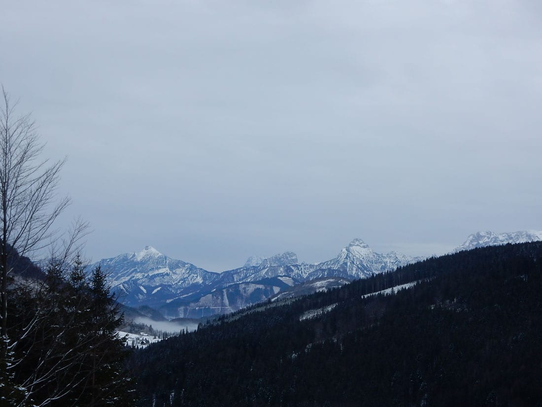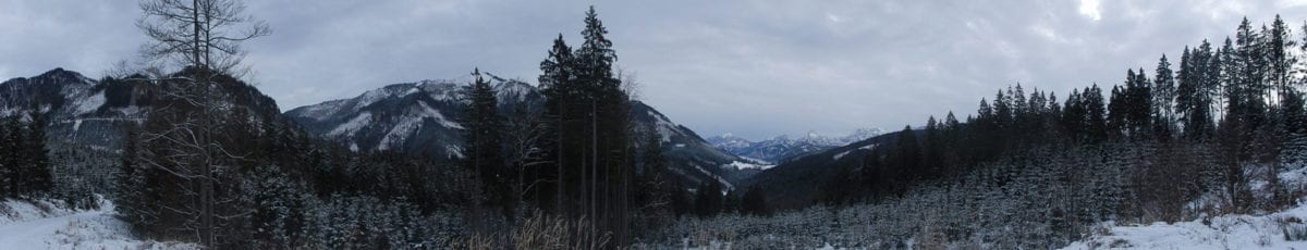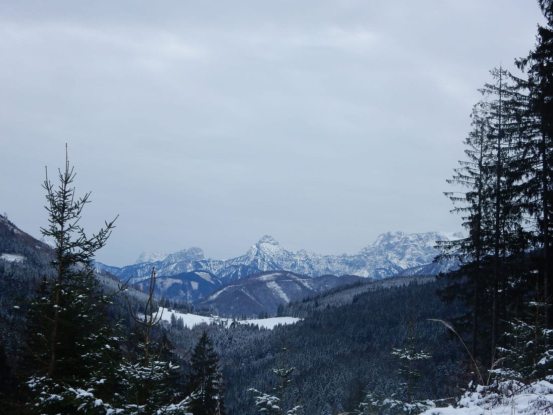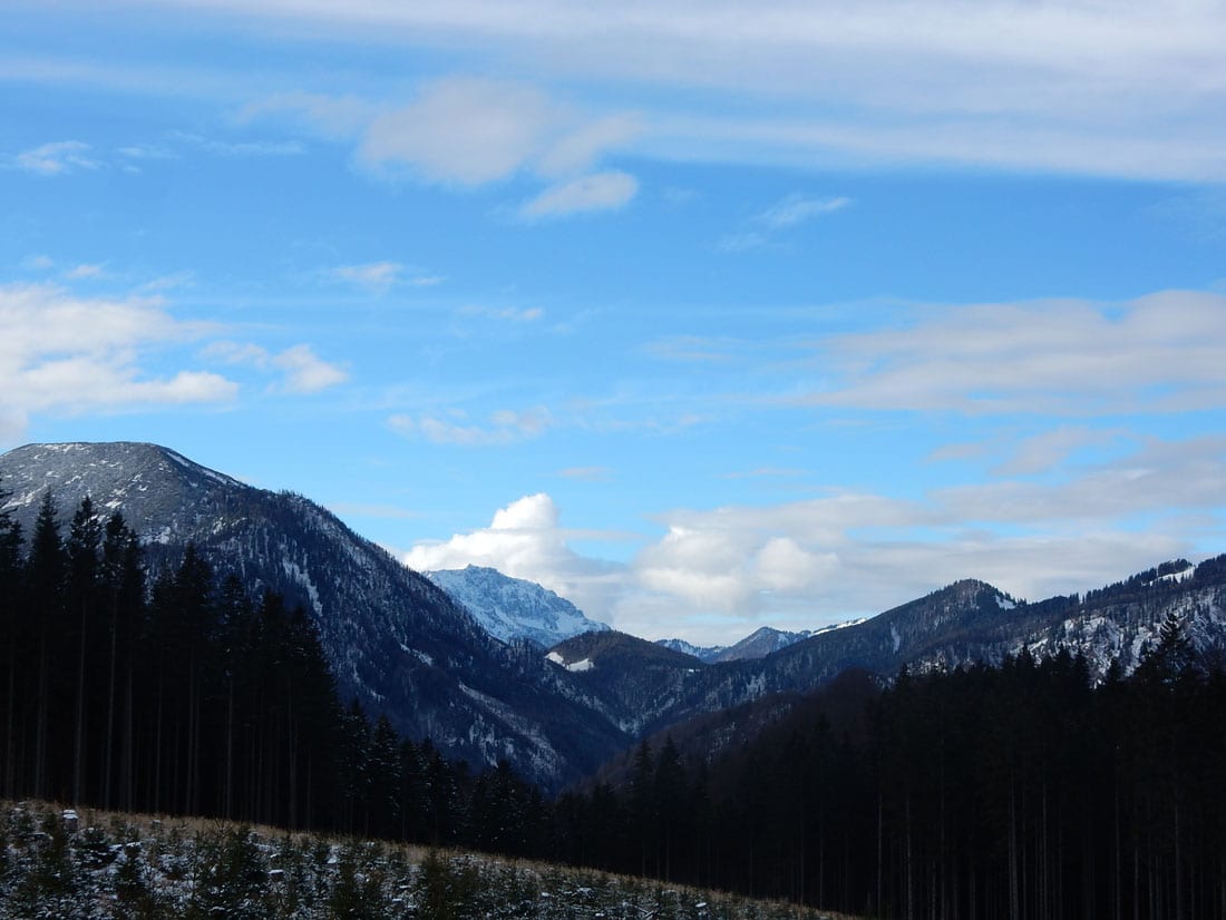 Wir wandern also über den Hansgraben zum Hirschkogelsattel (erste Pause mit Jause) und von dort weiter über die Moutainbikestrecke. Die machten einen großen Bogen rund um den Sonnberg und dabei gibt es Ausblicke zu den Haller Mauern, dem Toten Gebirgen und dem Sengsengebirge.