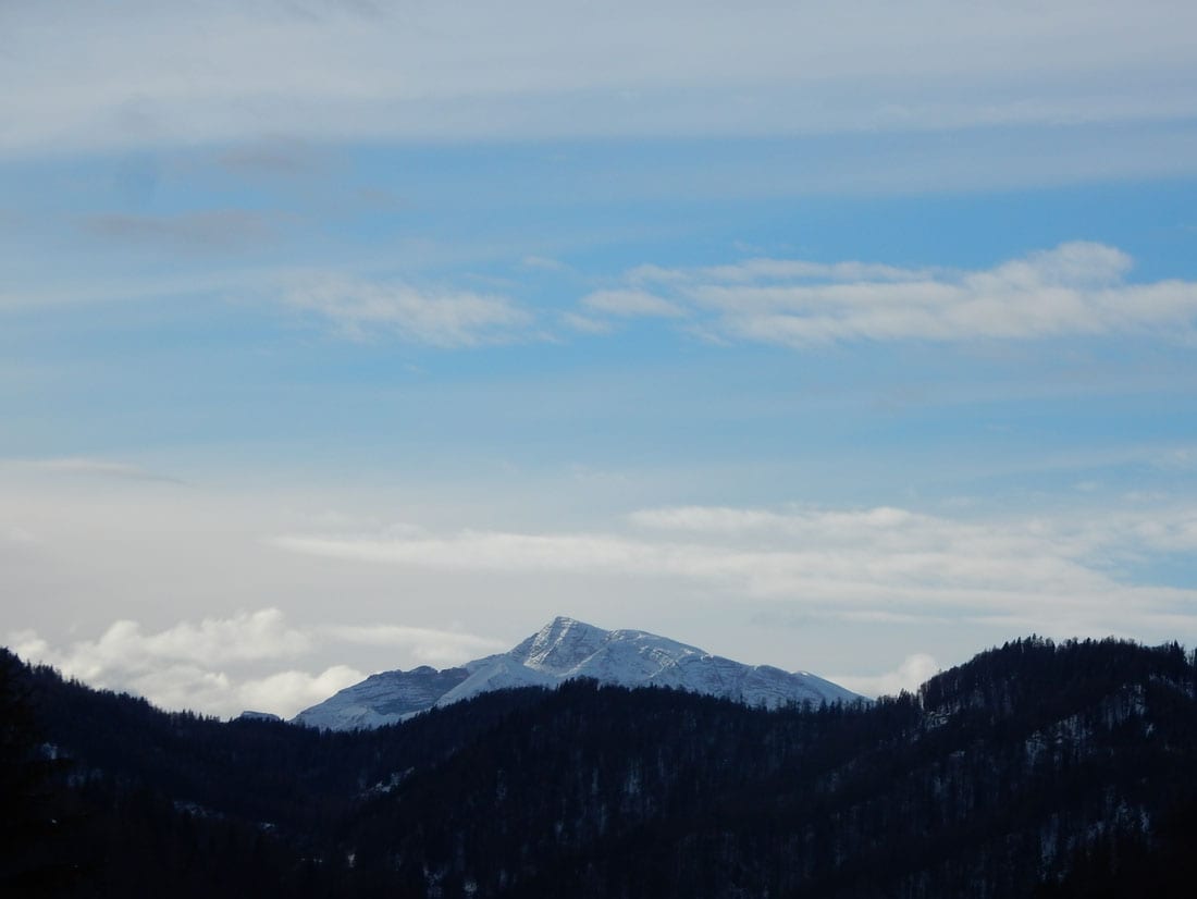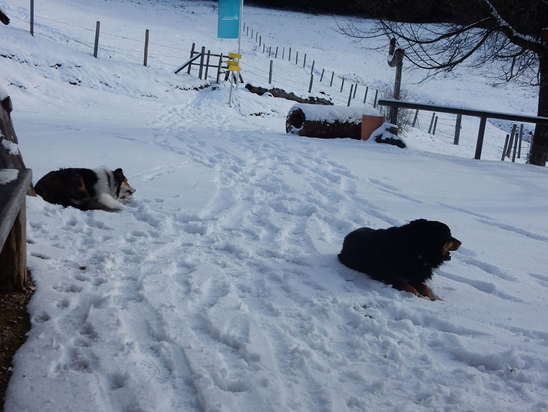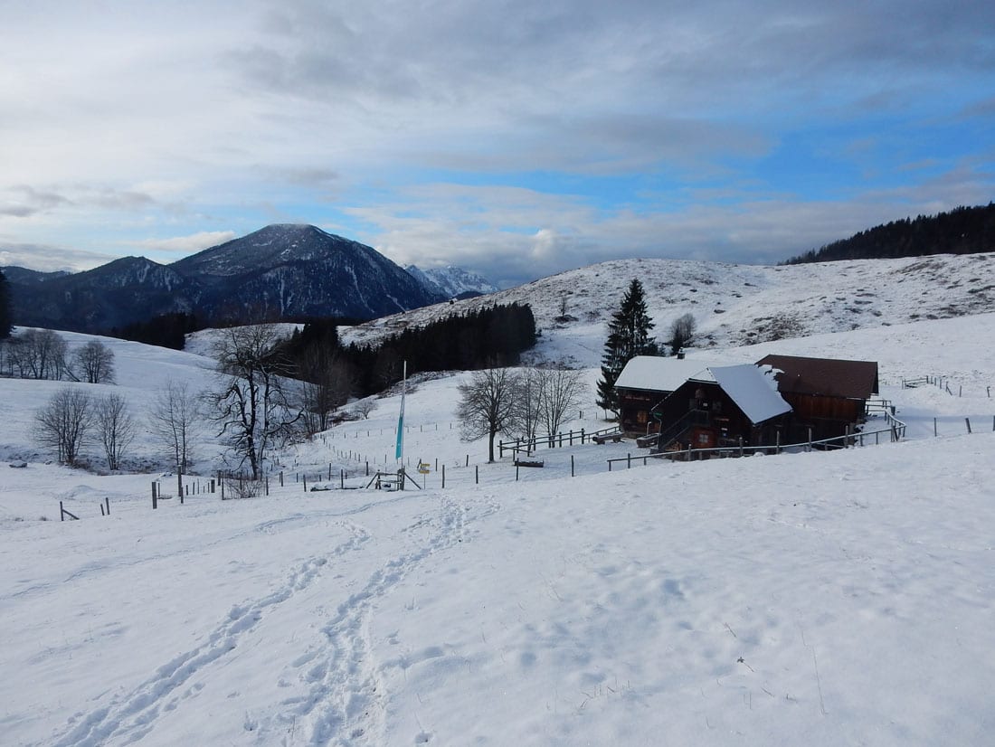 Auf der Anlaufalm angekommen glitzert der Schnee sogar ein bisserl und so ist die Pause mit Jause ein ganz kurzes Sonnenbad.