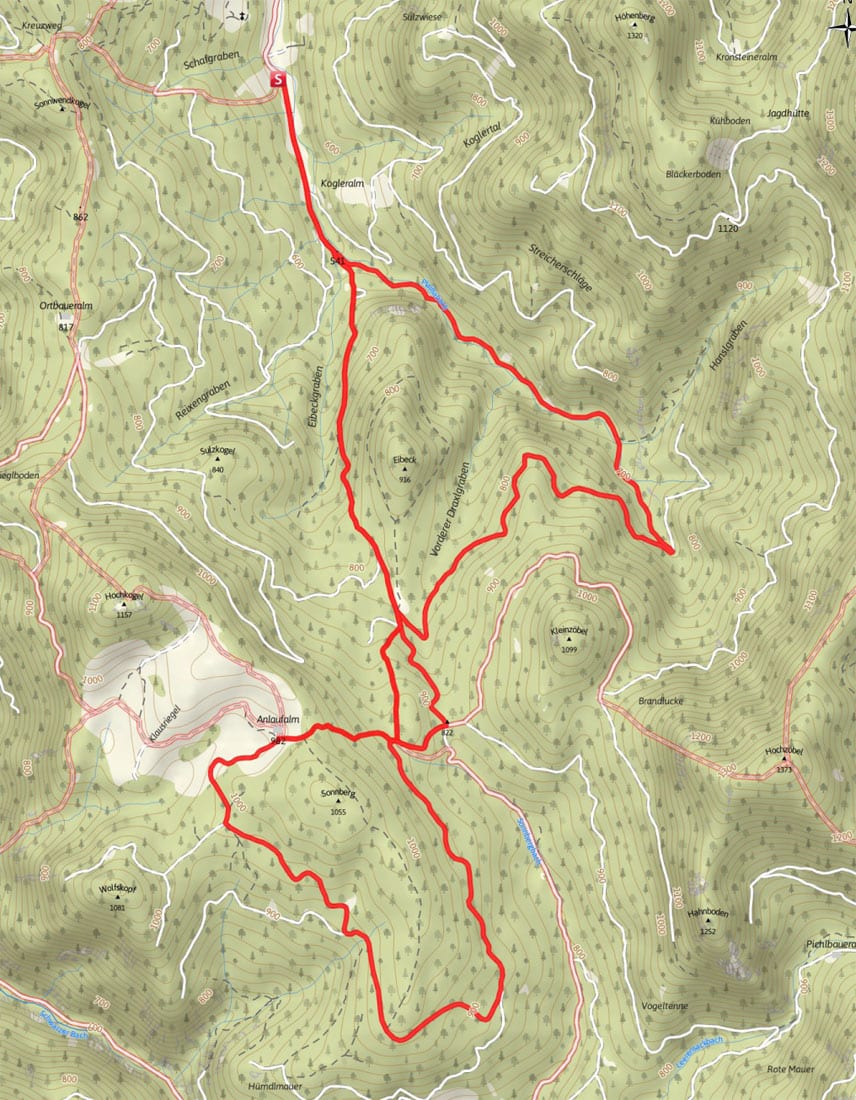 Von der Anlaufalm aus nehmen wir den Pfad direkt hinter durch den Wald und über die Forststraße.