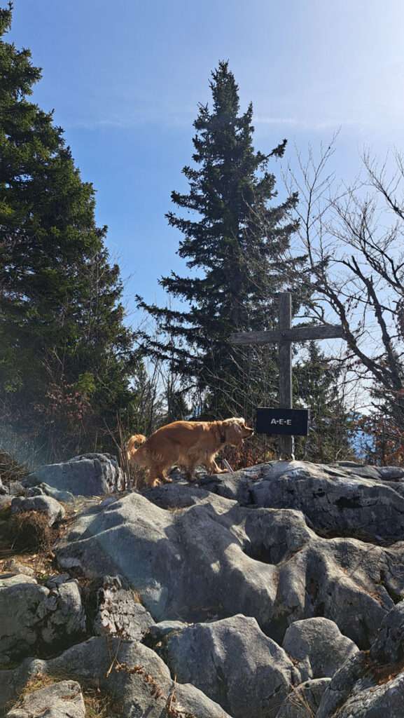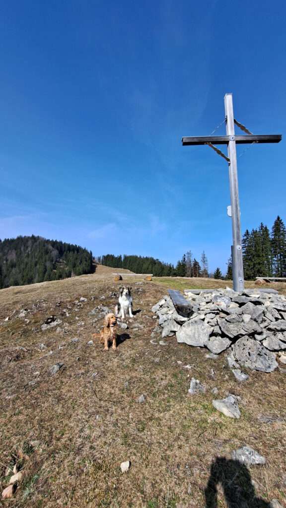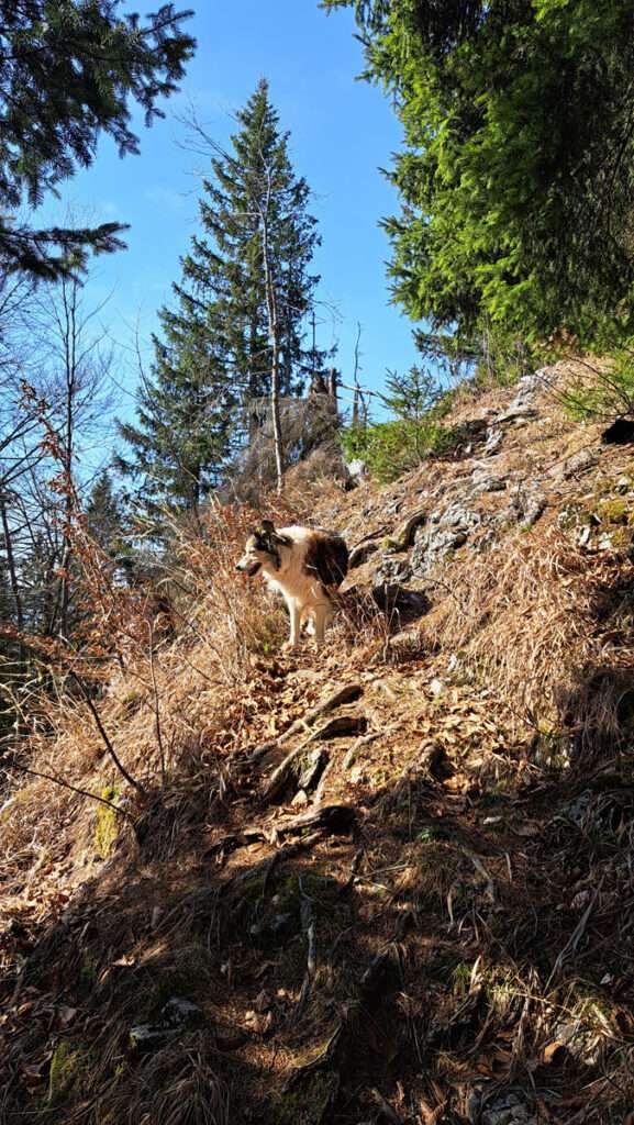 Nein, doch nicht – fast hätte ich es vergessen: Das letzte Stück vor dem Gipfel ist komplett mit umgefallen Bäumen verlegt. Rauf kommen wir jetzt nur mehr über einen Umweg.