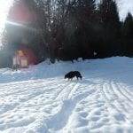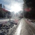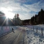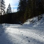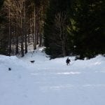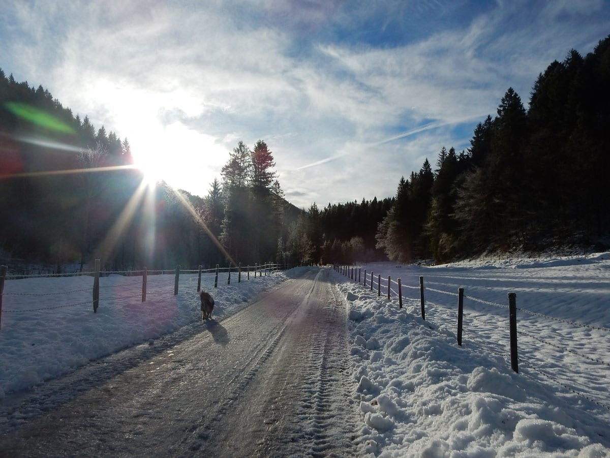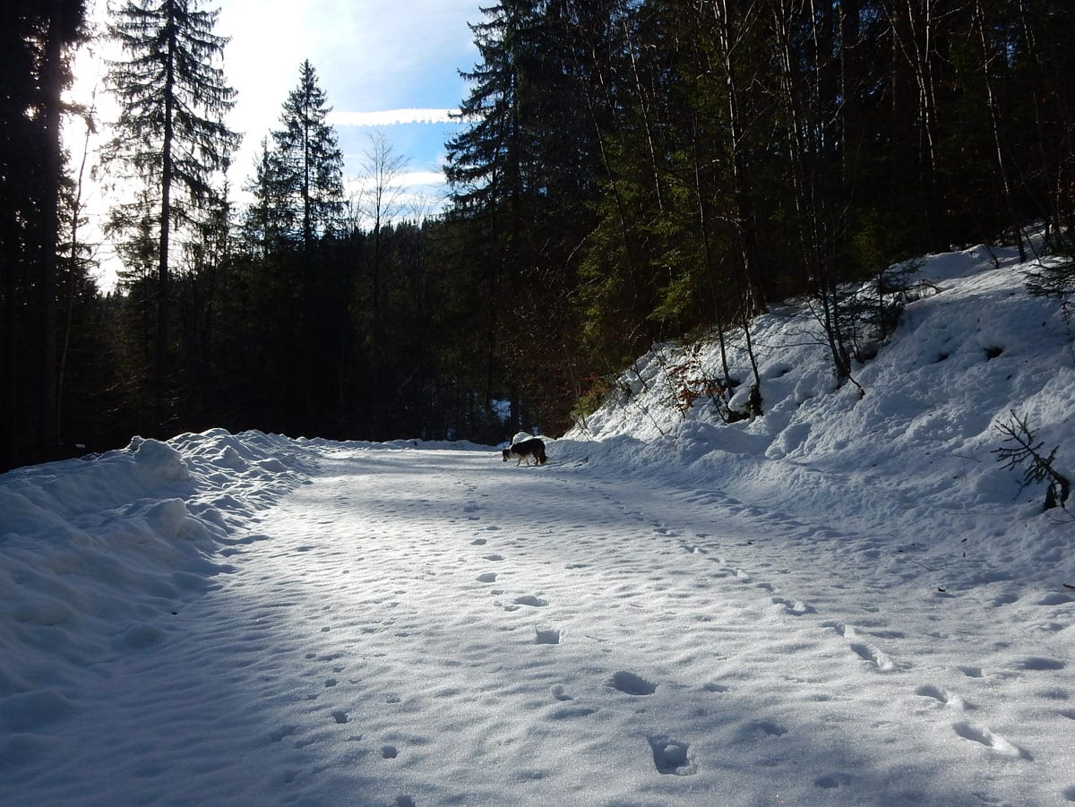 Aber es geht ja nur noch bergab. Das erste Stück durch weichen Tiefschnee, in dem wir alle drei bis über die Knie einsinken, dann aber wieder die Forststraße mit dem Eis drauf. Am Ende sind wir fast 2 Stunden länger unterwegs als geplant und schaffen es gerade noch vor Einbruch der Dunkelheit ins Auto.
