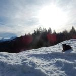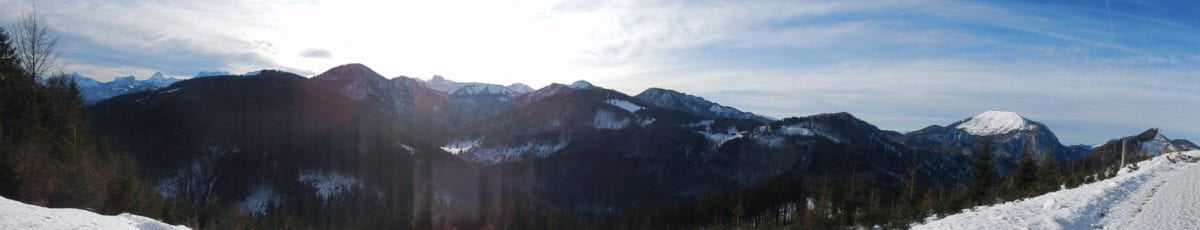 Für den Weg zur Anlaufalm wählen wir die längere Strecke um den Sonnberg herum – das sind wir ja schon gegangen – weil es dabei besonders viele Ausblicke geben wird. Das mit den Ausblicken stimmt, aber was wir dabei nicht bedacht haben, ist der Winter (logisch, warum auch, im Dezember). Mit Schneeschuhen dauert es doch viel länger als geplant und ein bisserl anstengender ist es auch (s’Herrl kann ein Lied davon singen).