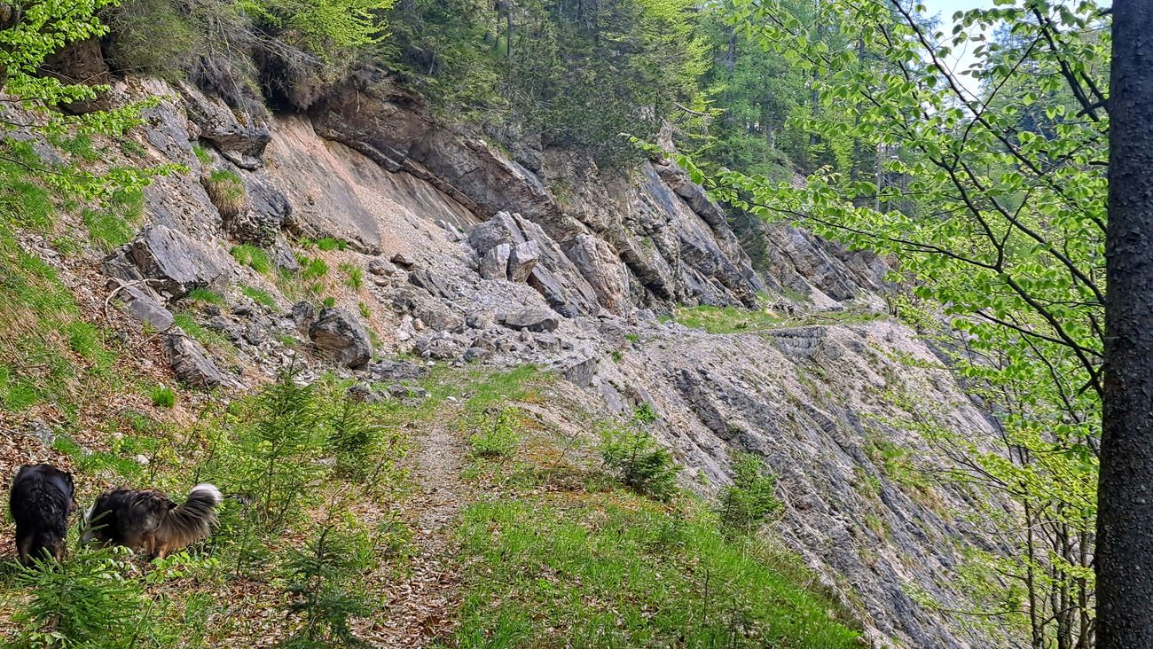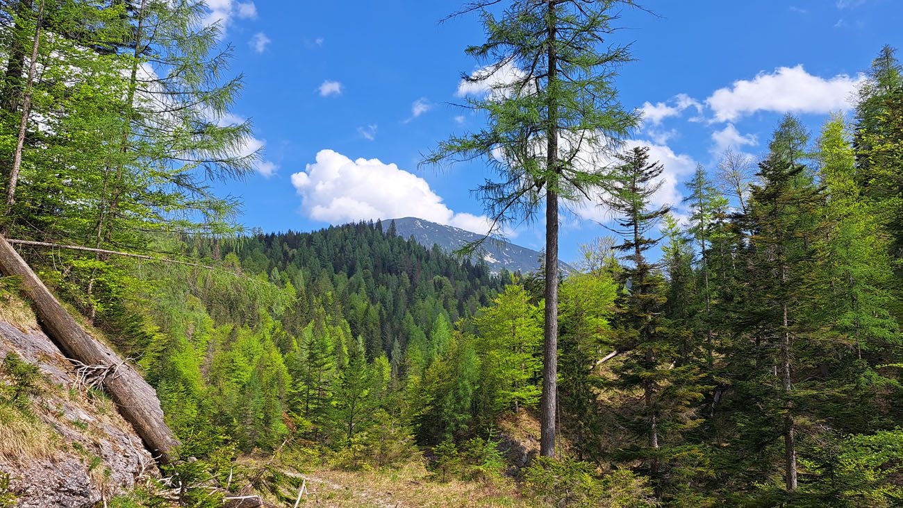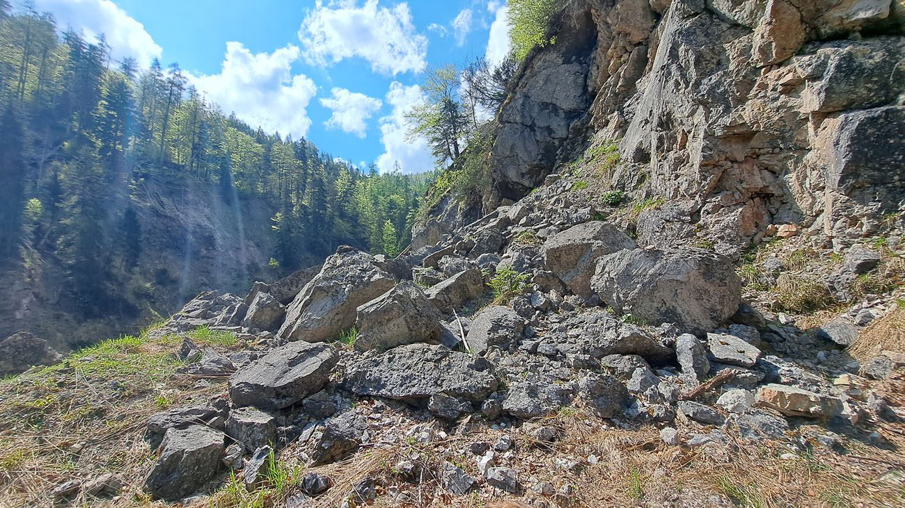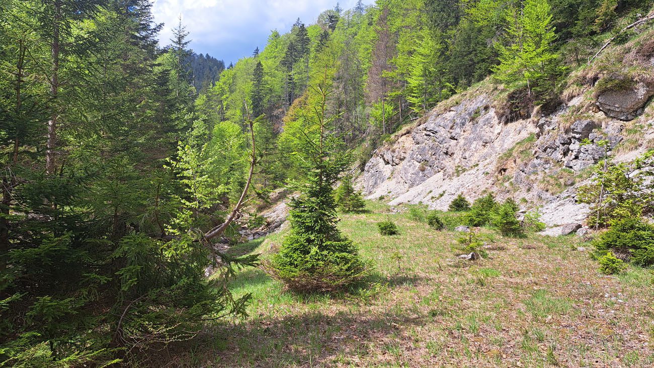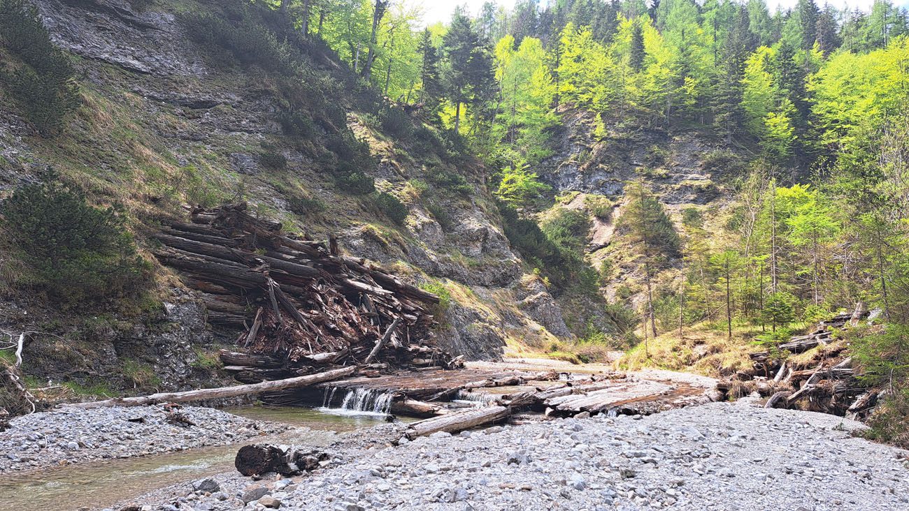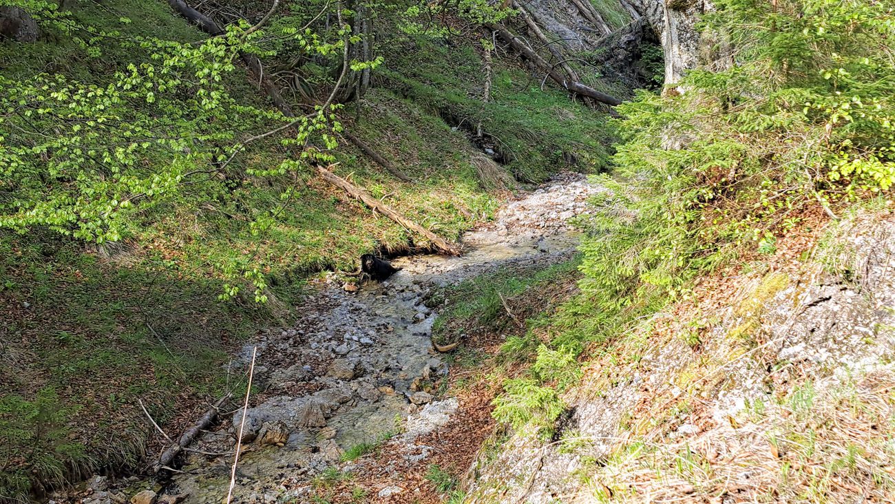 Ab der Abzweigung von Radweg (der dann zur Dörflmoaralm führt) wird es sehr einsam, hierhin verirren sich keine Menschen. Kein Wunder, da gibt es keine kennzeichneten Wege und überall liegen Baumstämme kreuz und quer herum und ein paar Felsstürze versperren den Weg. Also alles so, wie es sein soll 🙂