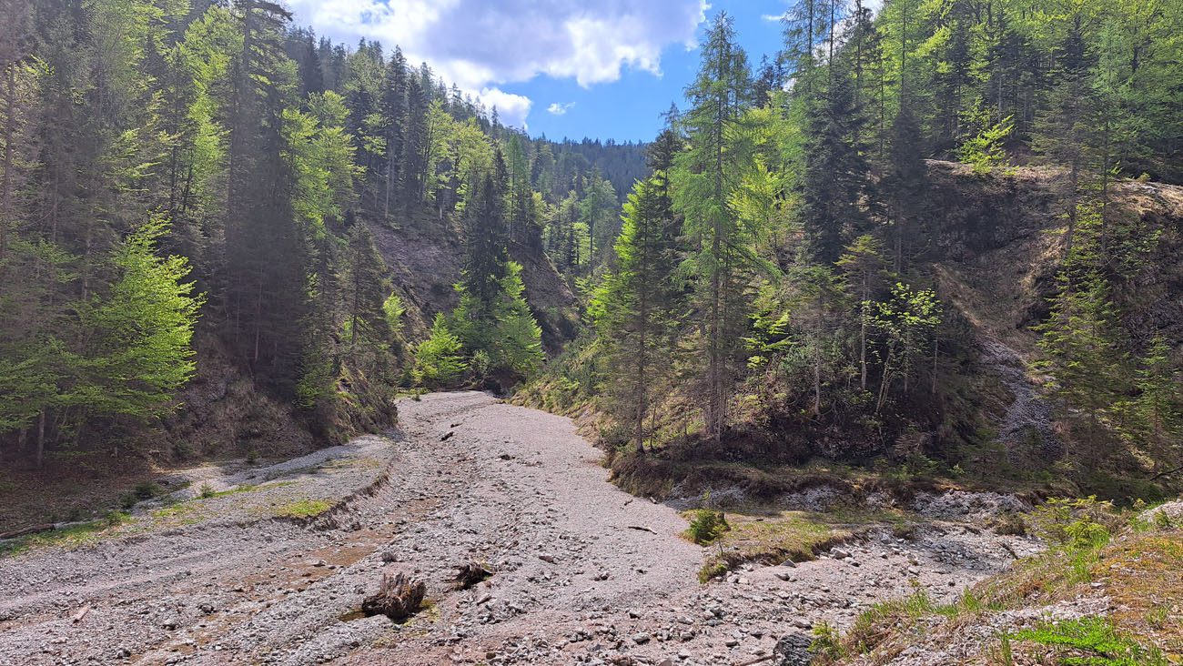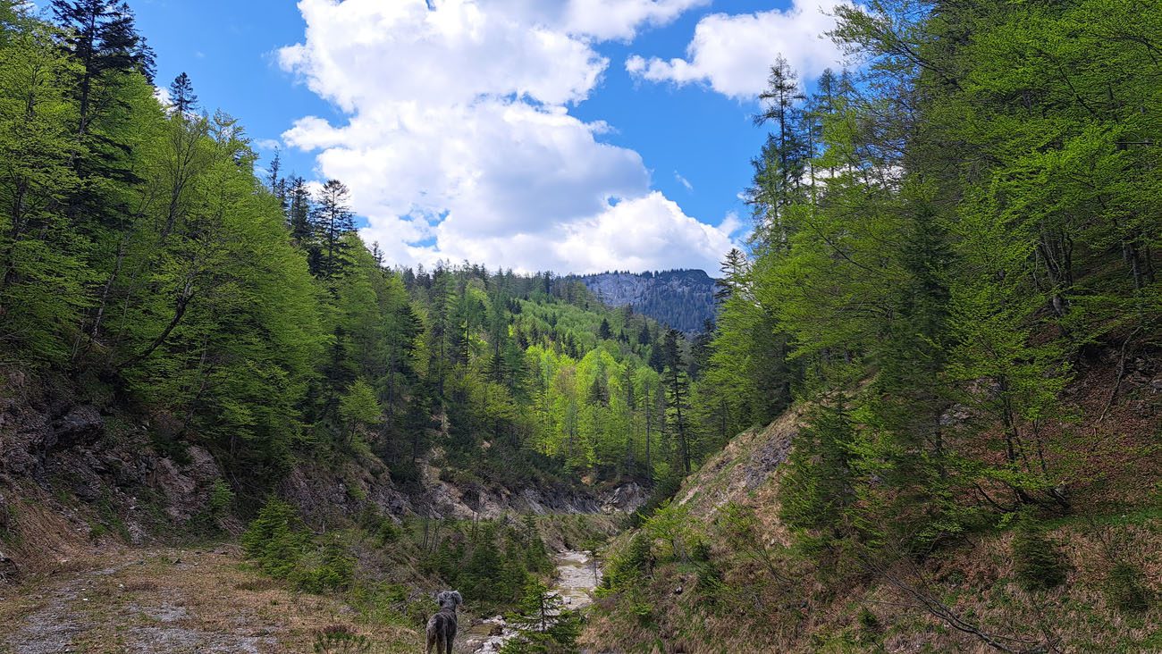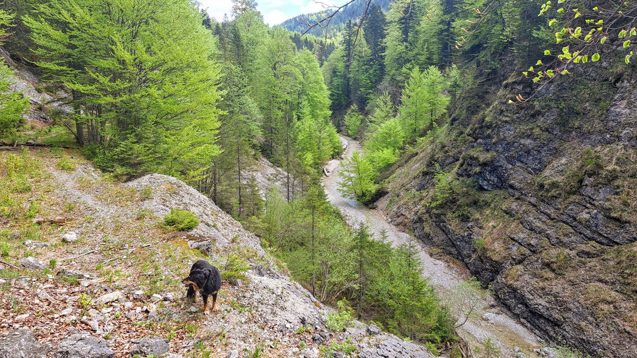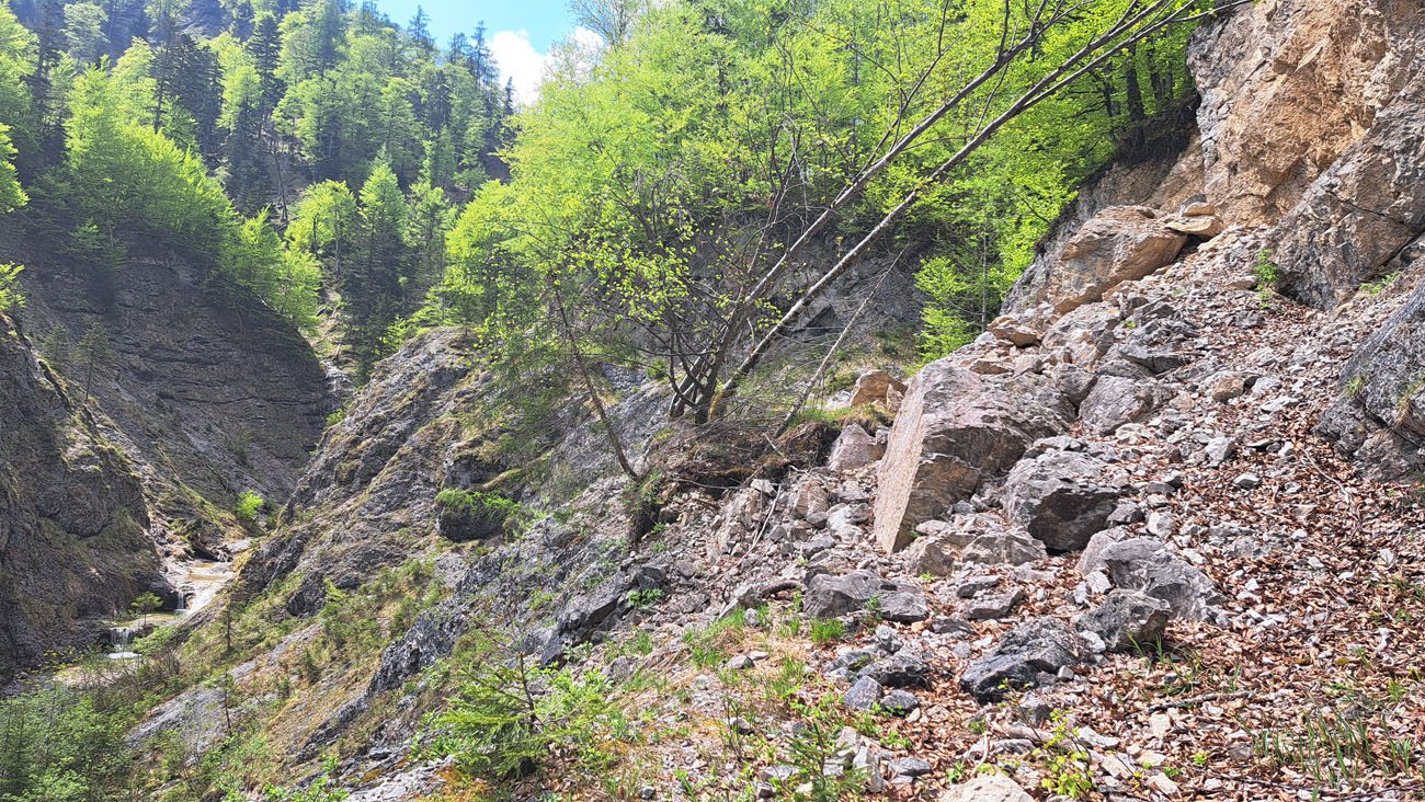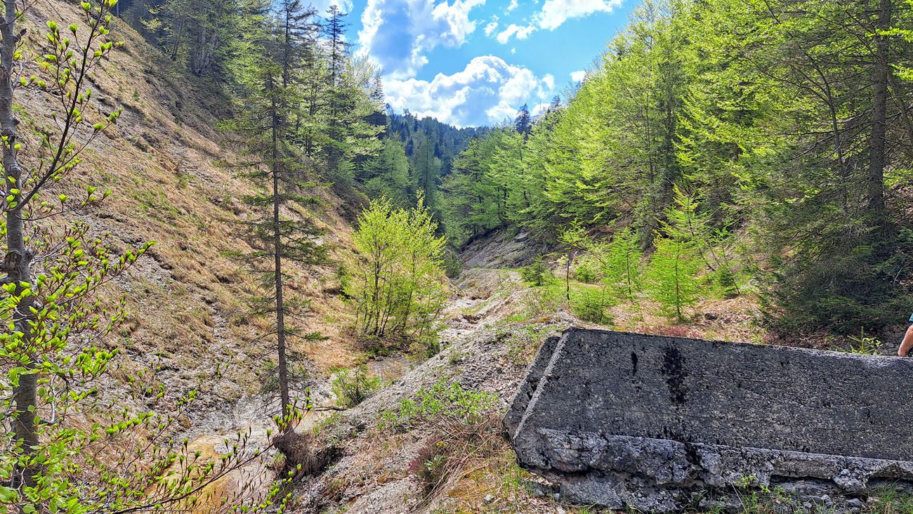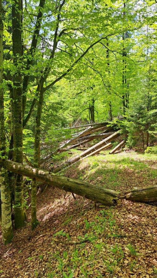 Ab der Abzweigung von Radweg (der dann zur Dörflmoaralm führt) wird es sehr einsam, hierhin verirren sich keine Menschen. Kein Wunder, da gibt es keine kennzeichneten Wege und überall liegen Baumstämme kreuz und quer herum und ein paar Felsstürze versperren den Weg. Also alles so, wie es sein soll 🙂