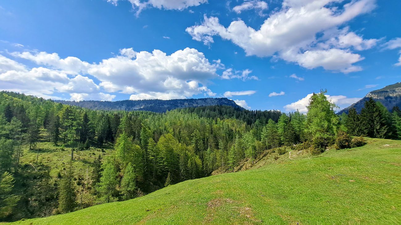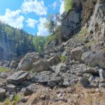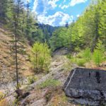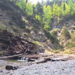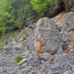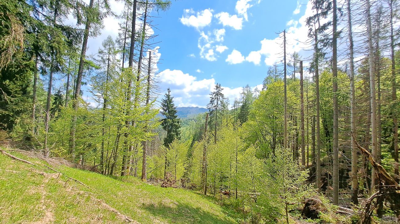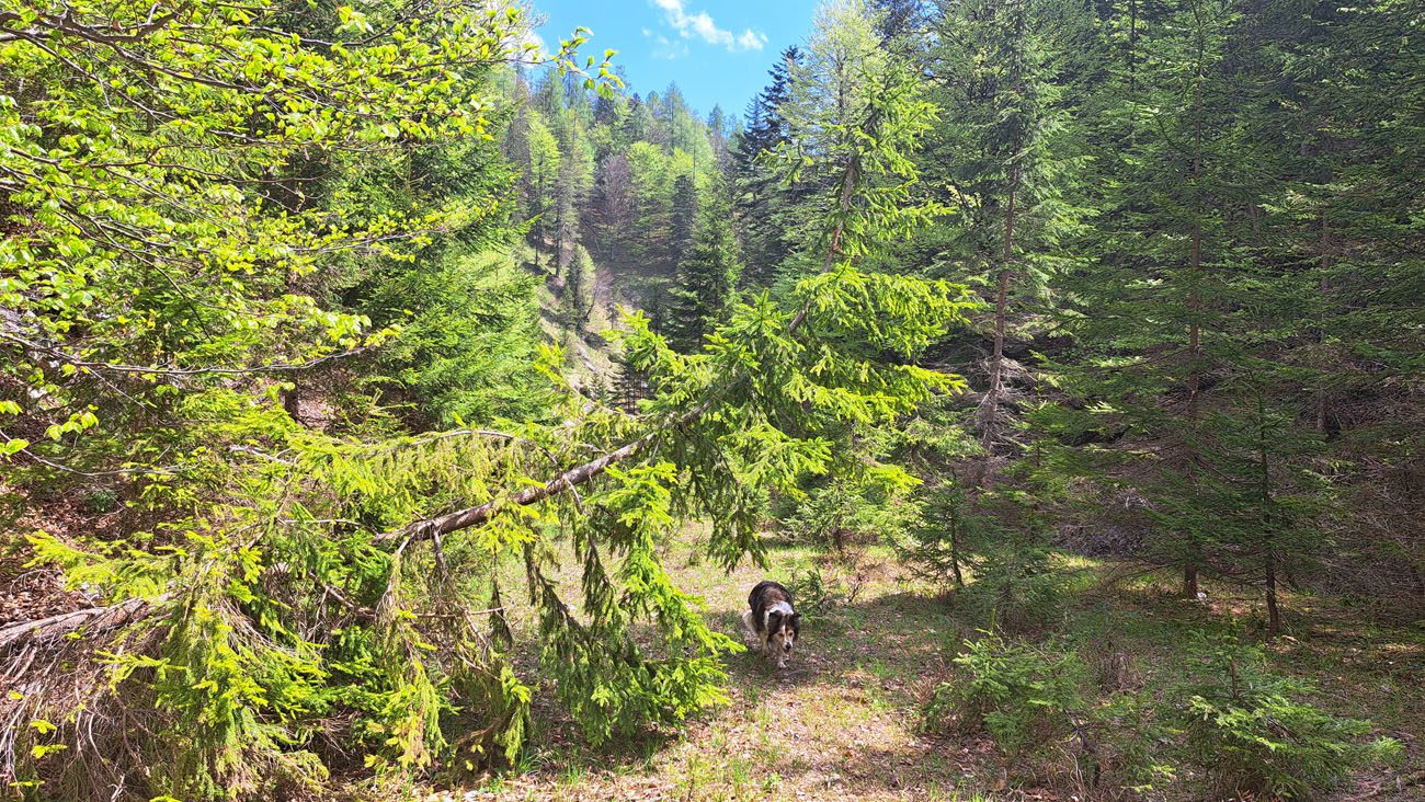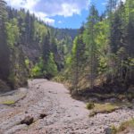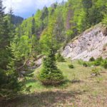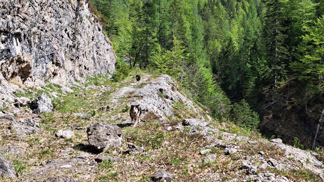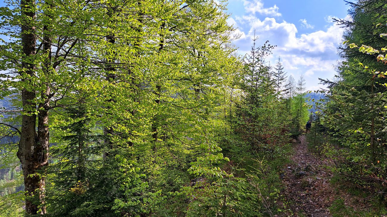 Ab der Abzweigung von Radweg (der dann zur Dörflmoaralm führt) wird es sehr einsam, hierhin verirren sich keine Menschen. Kein Wunder, da gibt es keine kennzeichneten Wege und überall liegen Baumstämme kreuz und quer herum und ein paar Felsstürze versperren den Weg. Also alles so, wie es sein soll 🙂