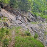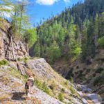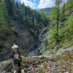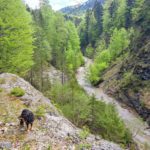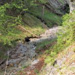 Wir schauen uns auch einen langen Seitengraben vom Sitzenbach an – von hier aus versuchen Ernst und Mato einen Weg hinauf zur Stöffelalm zu finden. S’Herrl, die Ronja und ich bleiben aber neben dem Bach und weiter gehts zur Klause. Auf dem Weg zur Stöffelalm versperrt uns dann ein wahnsinnig großes Ungeheuer den Weg (denkt sich die Ronja): eine ca. 50 cm lange Kreuzotter liegt mitten auf dem Weg in der Sonne und ärgert sich ein bisserl über die Störung.